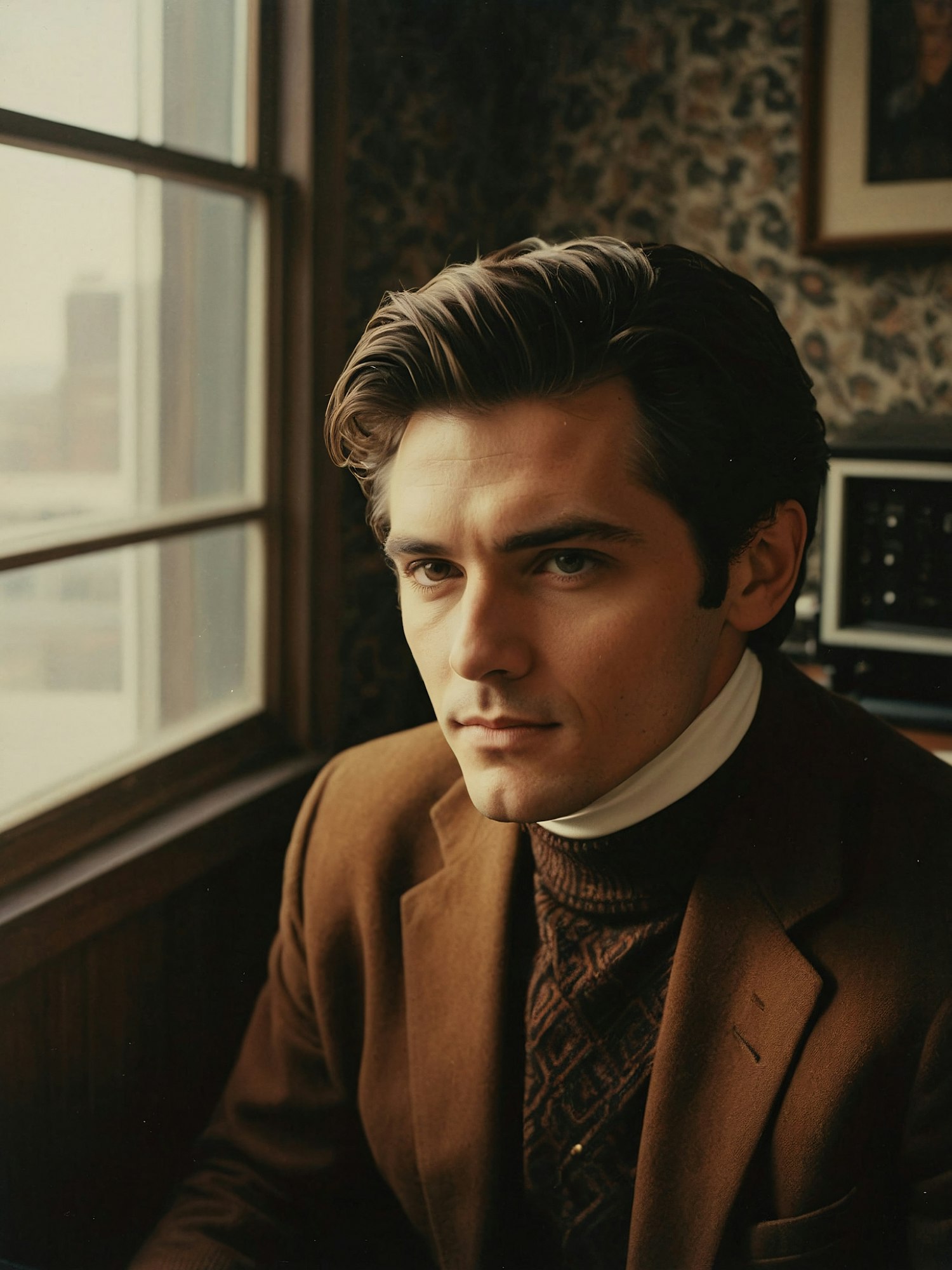 Caucasian man in brown blazer and sweater by window, vintage room, thoughtful expression, natural light.