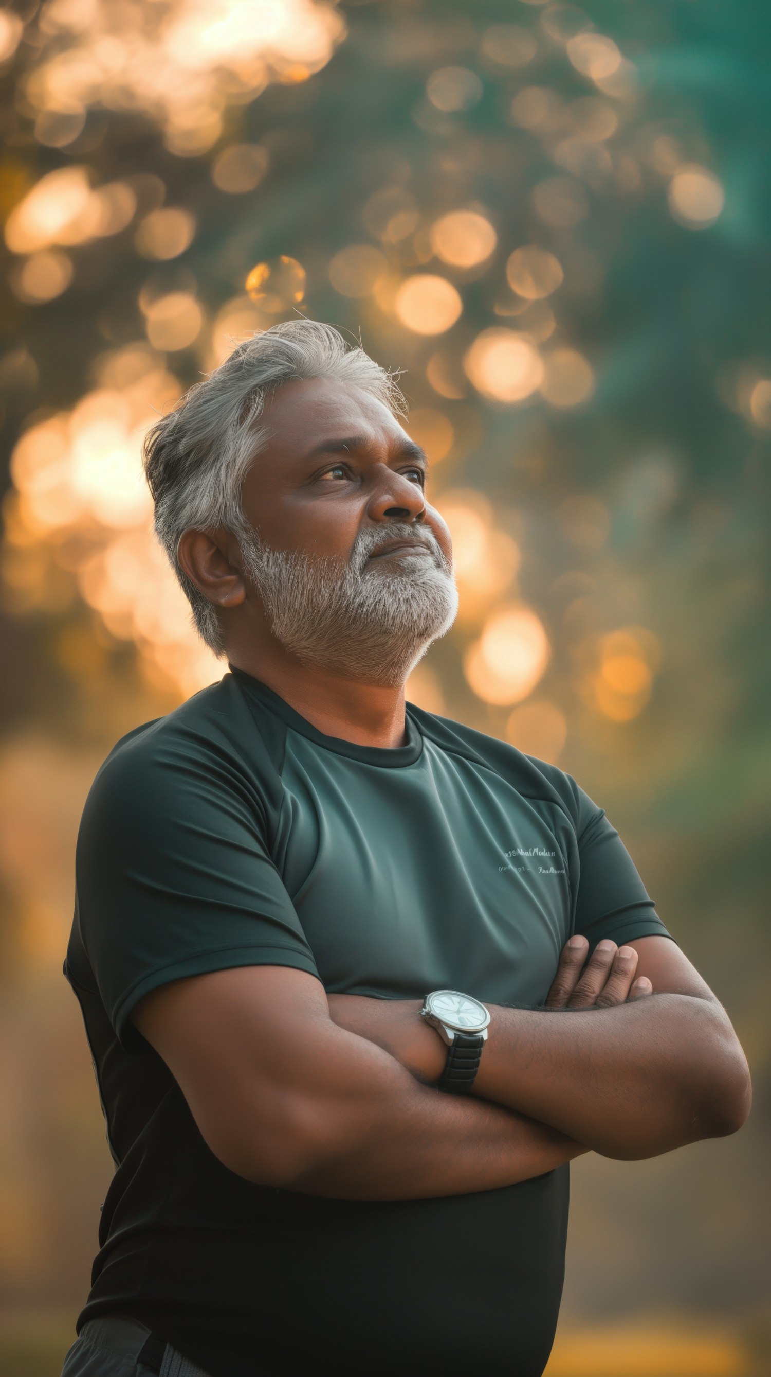 Older man with gray hair and beard, wearing a green shirt, stands confidently with arms crossed against a warm, blurred background.