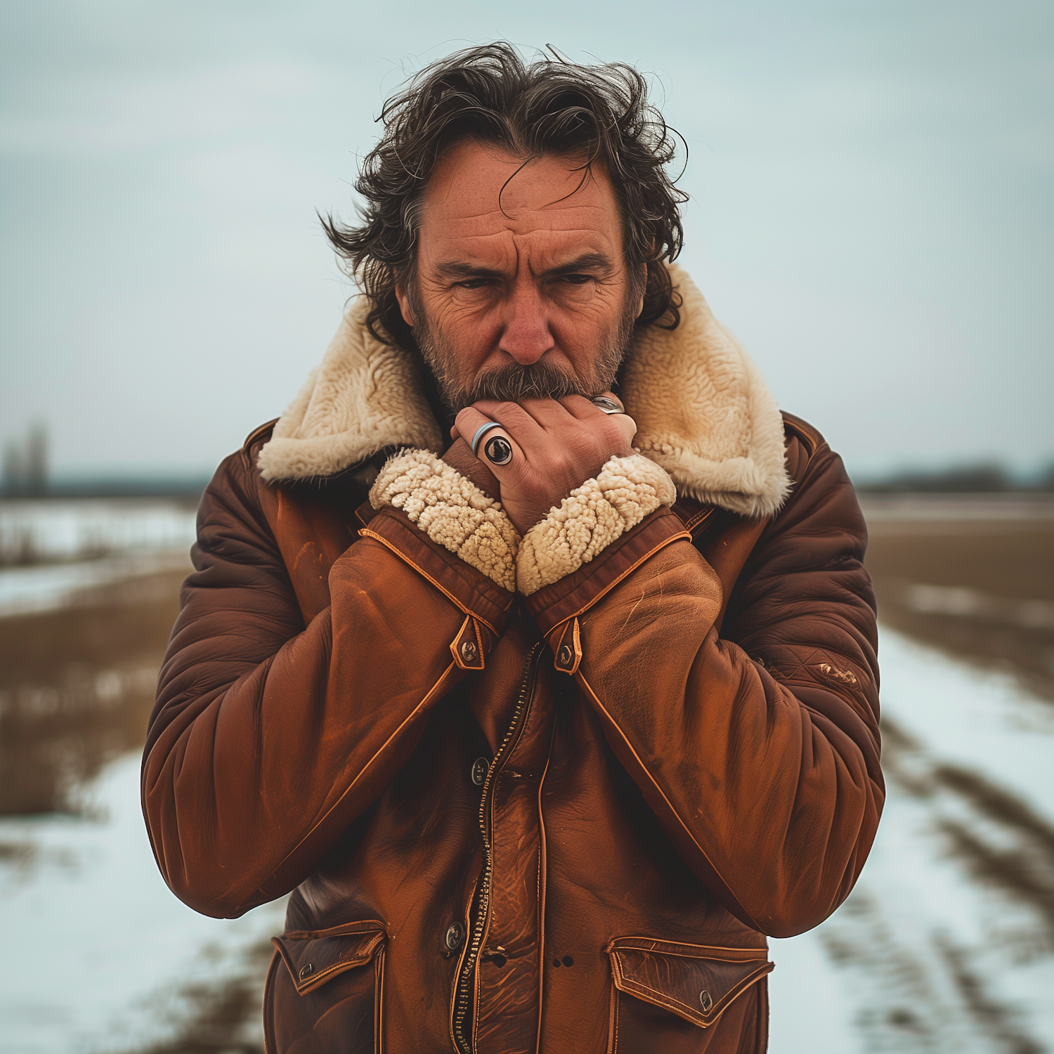 Middle-aged man in a brown leather jacket with shearling collar, standing in a snowy field, looking contemplative and cold.