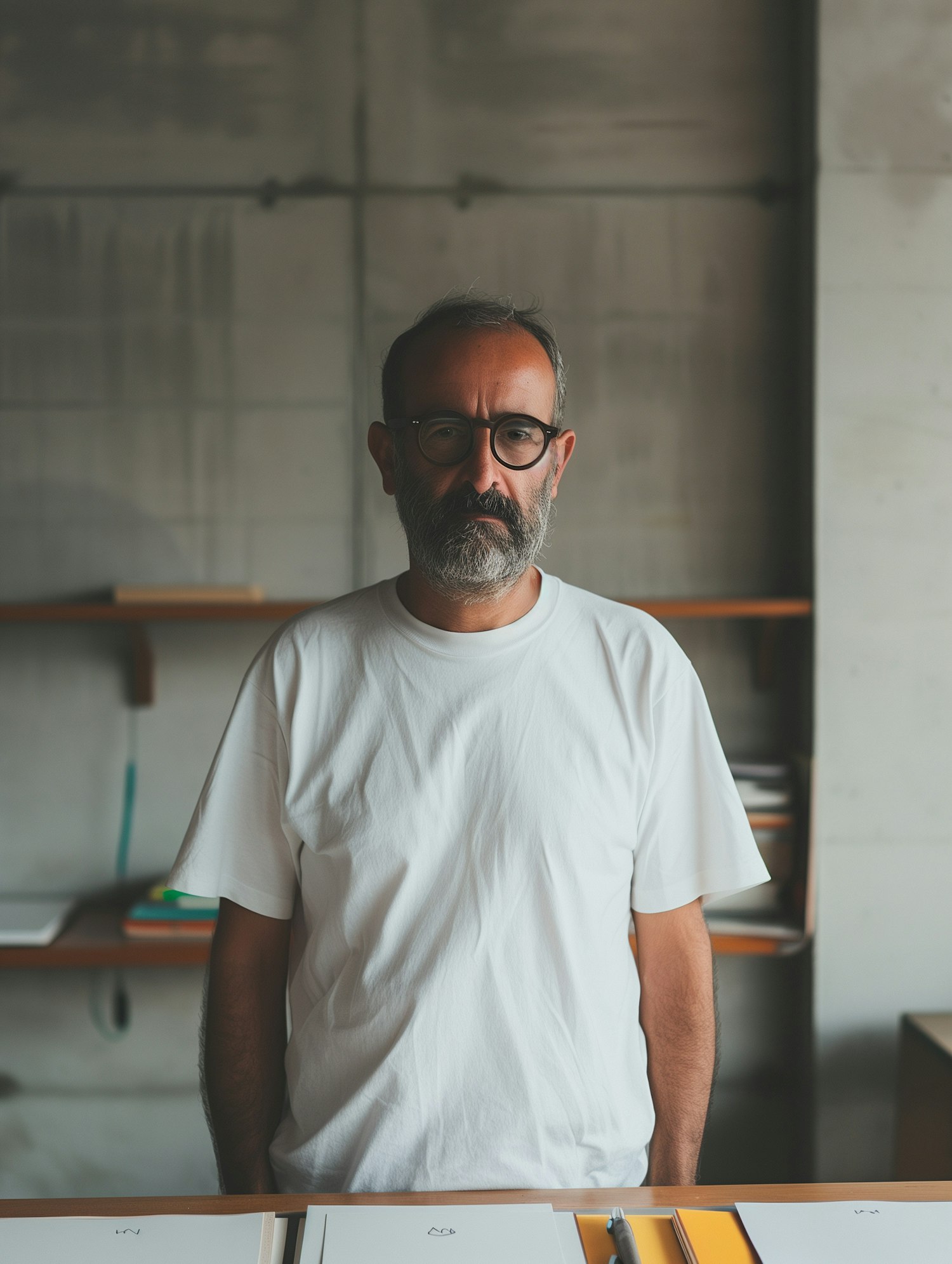 Middle-aged man with glasses and beard in a minimalist room, wearing a white t-shirt, standing behind a desk with papers.