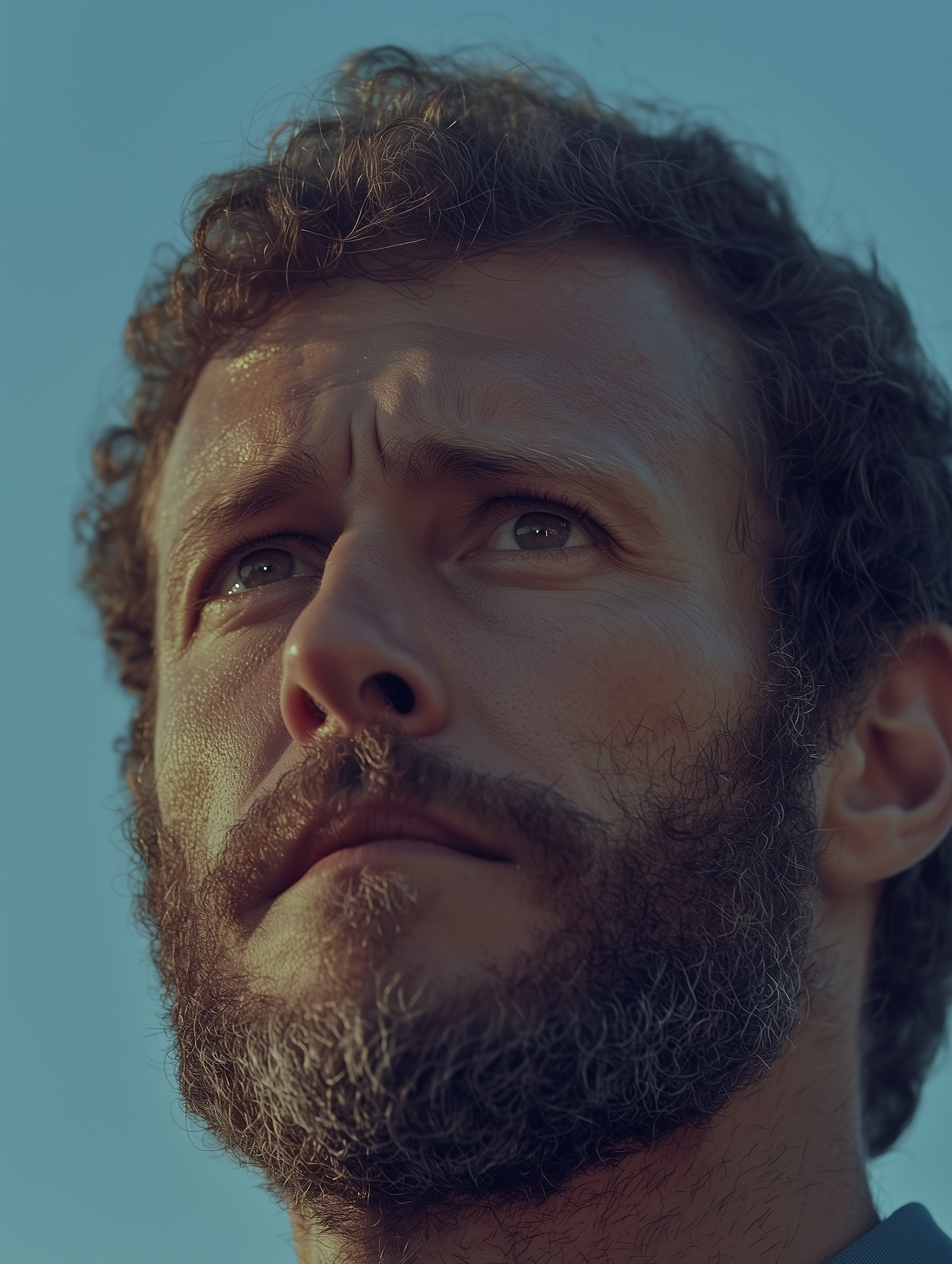 Close-up portrait of a bearded man with curly hair, looking contemplatively at the sky. Soft lighting and clear blue background.