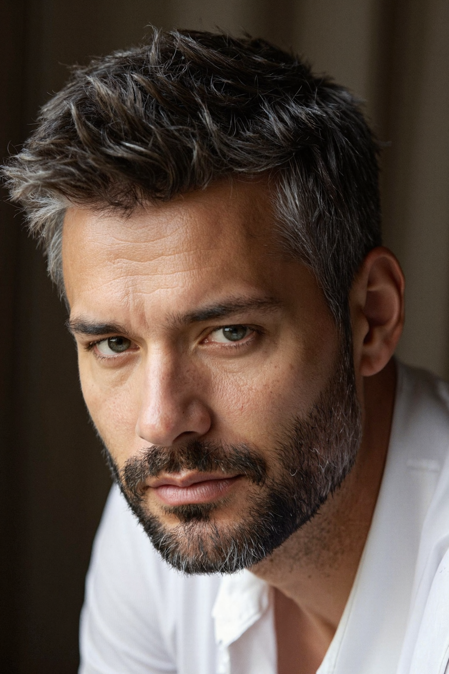 Caucasian man with gray-streaked hair and beard, wearing a white shirt, gazes intently with green eyes. Soft lighting enhances his rugged look.