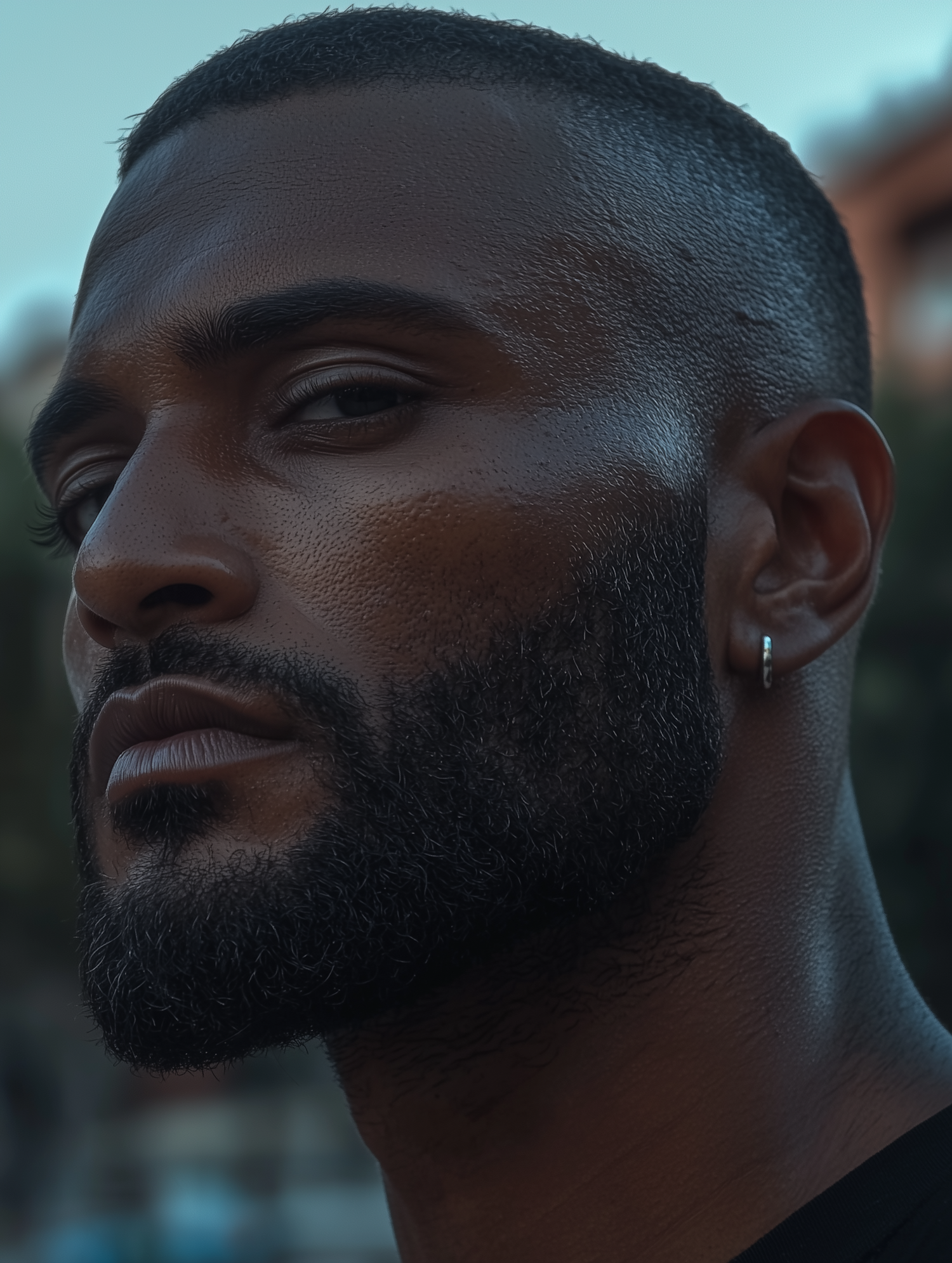 Close-up portrait of a Black man with a beard, short hair, and hoop earring, set against a blurred outdoor background.
