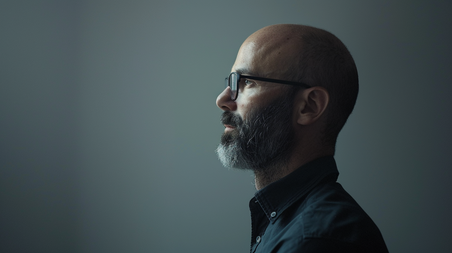 Profile of a bald man with glasses and a beard, wearing a dark shirt against a gray background, in a contemplative pose.