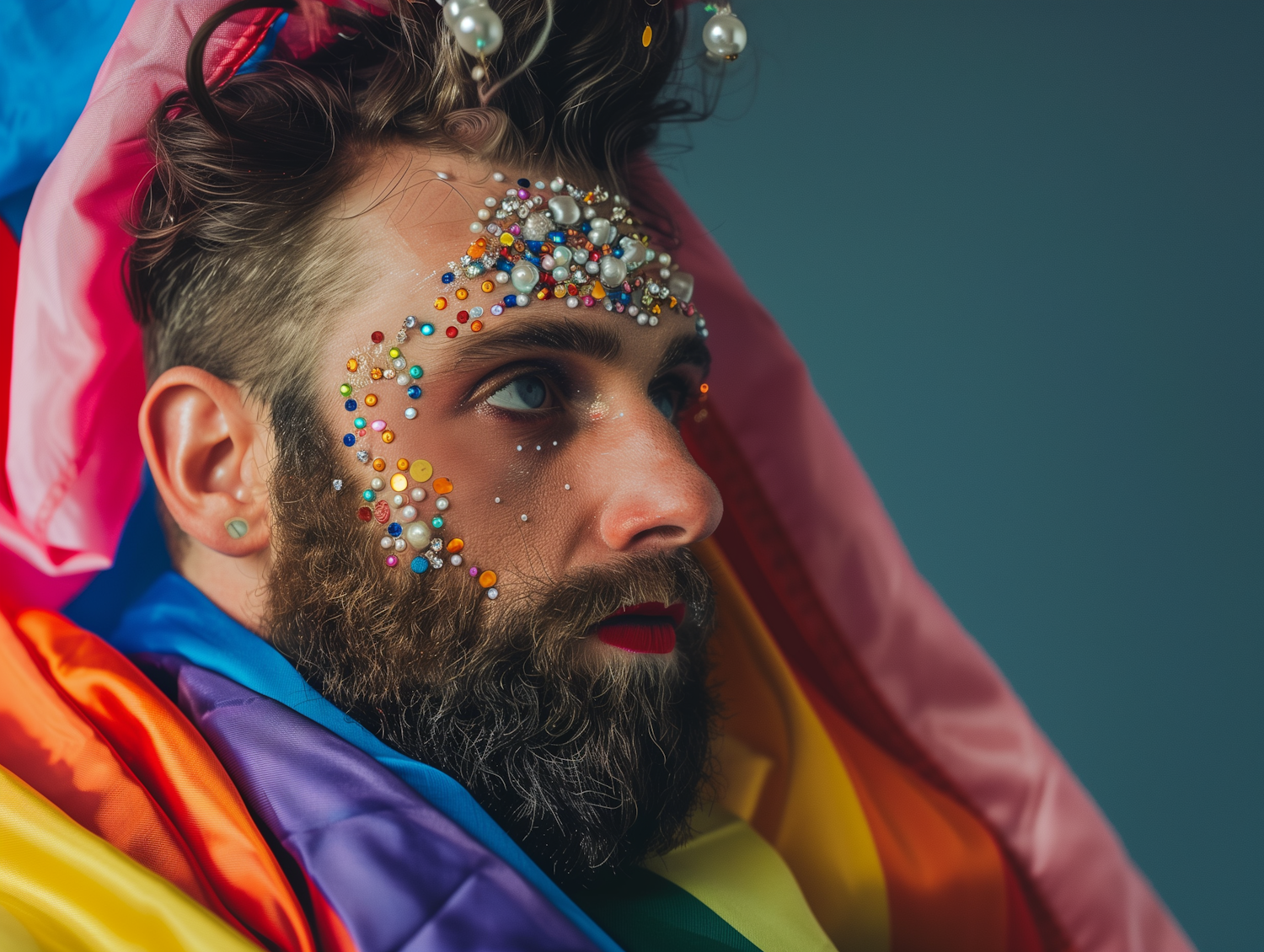 Contemplative Man with Bejeweled Beard and Rainbow Fabric