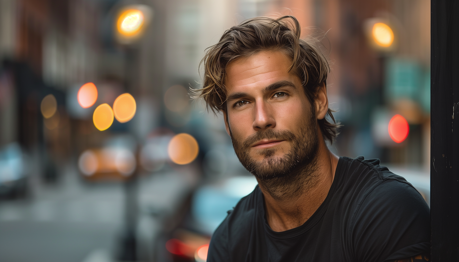 Caucasian man with wavy hair and beard in urban setting, wearing a black t-shirt. Soft bokeh lights create a modern, relaxed vibe.