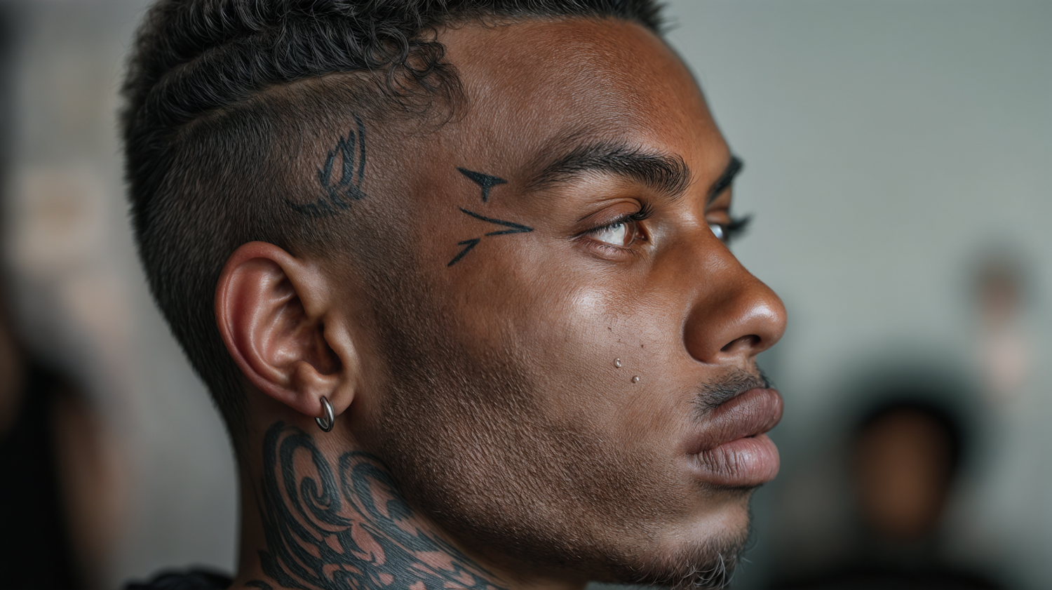 Close-up of a tattooed neck and ear with a hoop earring, showcasing intricate designs and personal style.