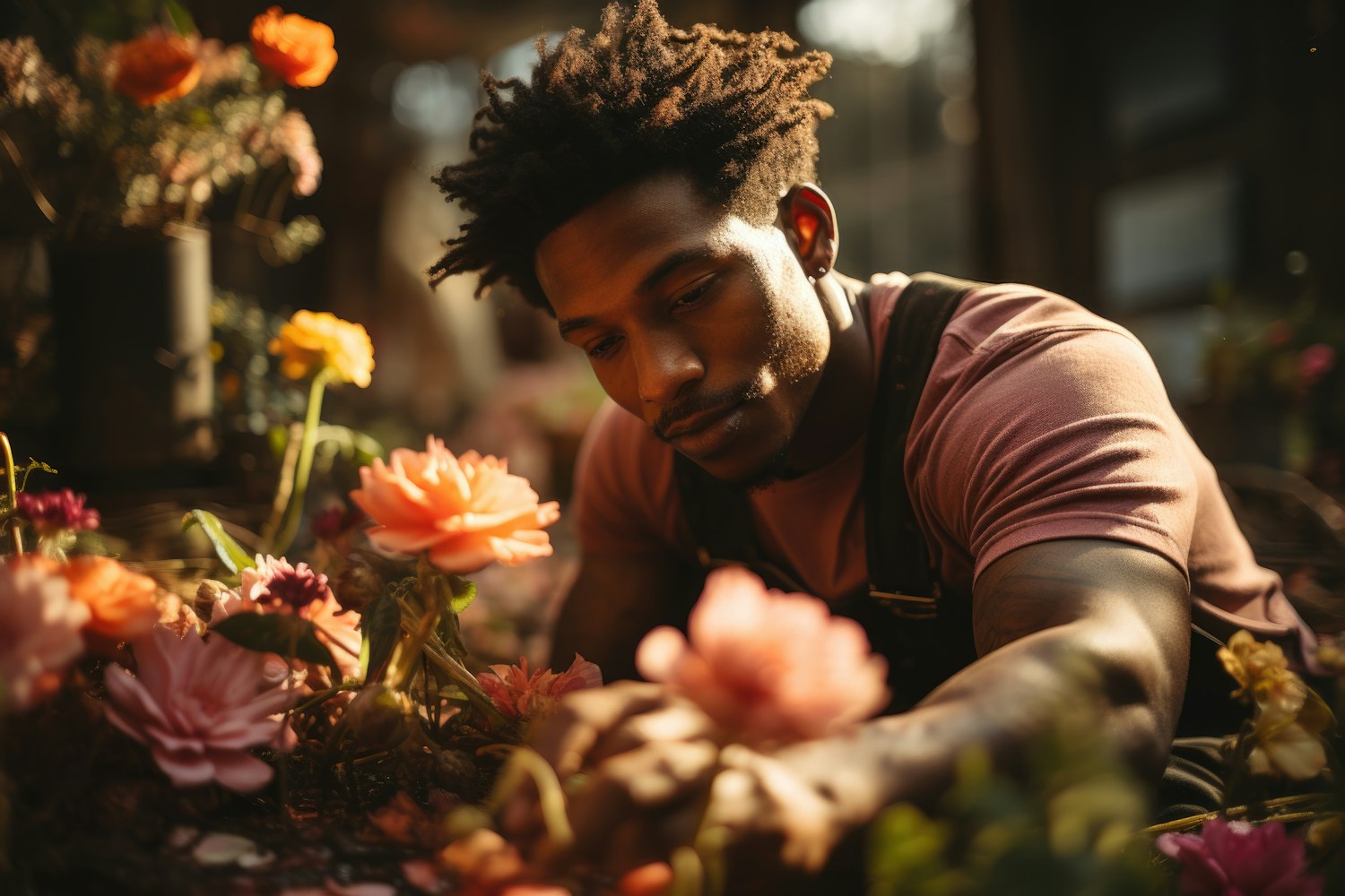 A man in overalls tends to colorful flowers in warm sunlight, showcasing a serene gardening moment.