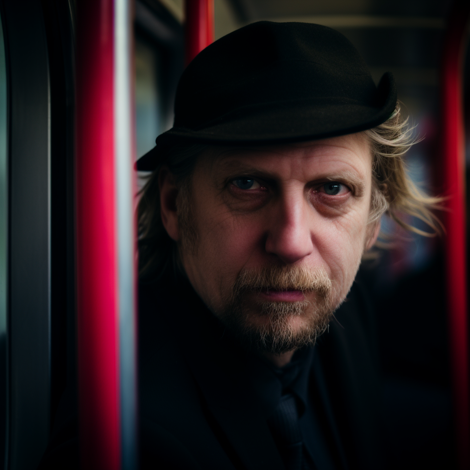 Close-up portrait of a middle-aged man with a black hat and serious expression, framed by red poles, possibly on public transport.