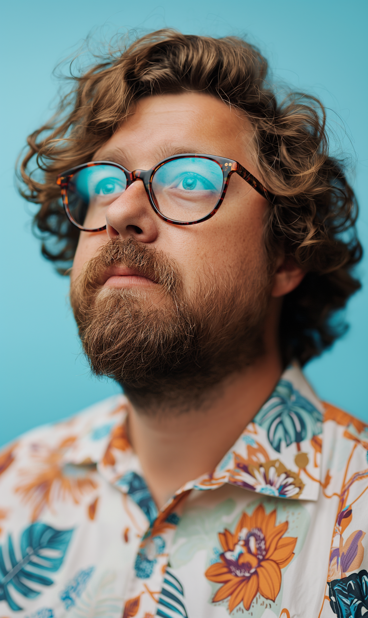 Caucasian man with curly hair and beard, wearing glasses and a floral shirt, gazes thoughtfully against a bright blue background.