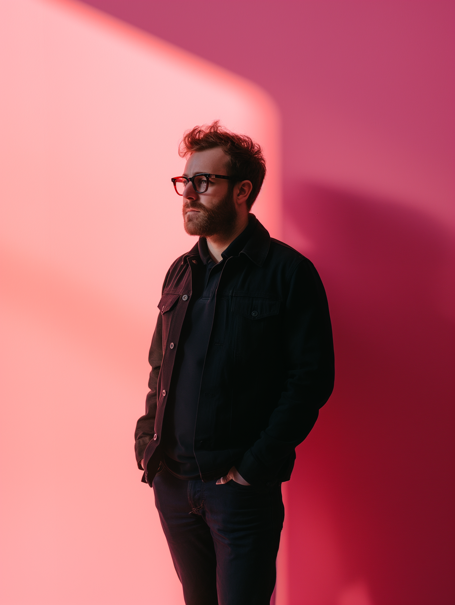 Man with glasses and beard stands against a vibrant pink background, wearing a dark jacket and pants, in dramatic lighting.