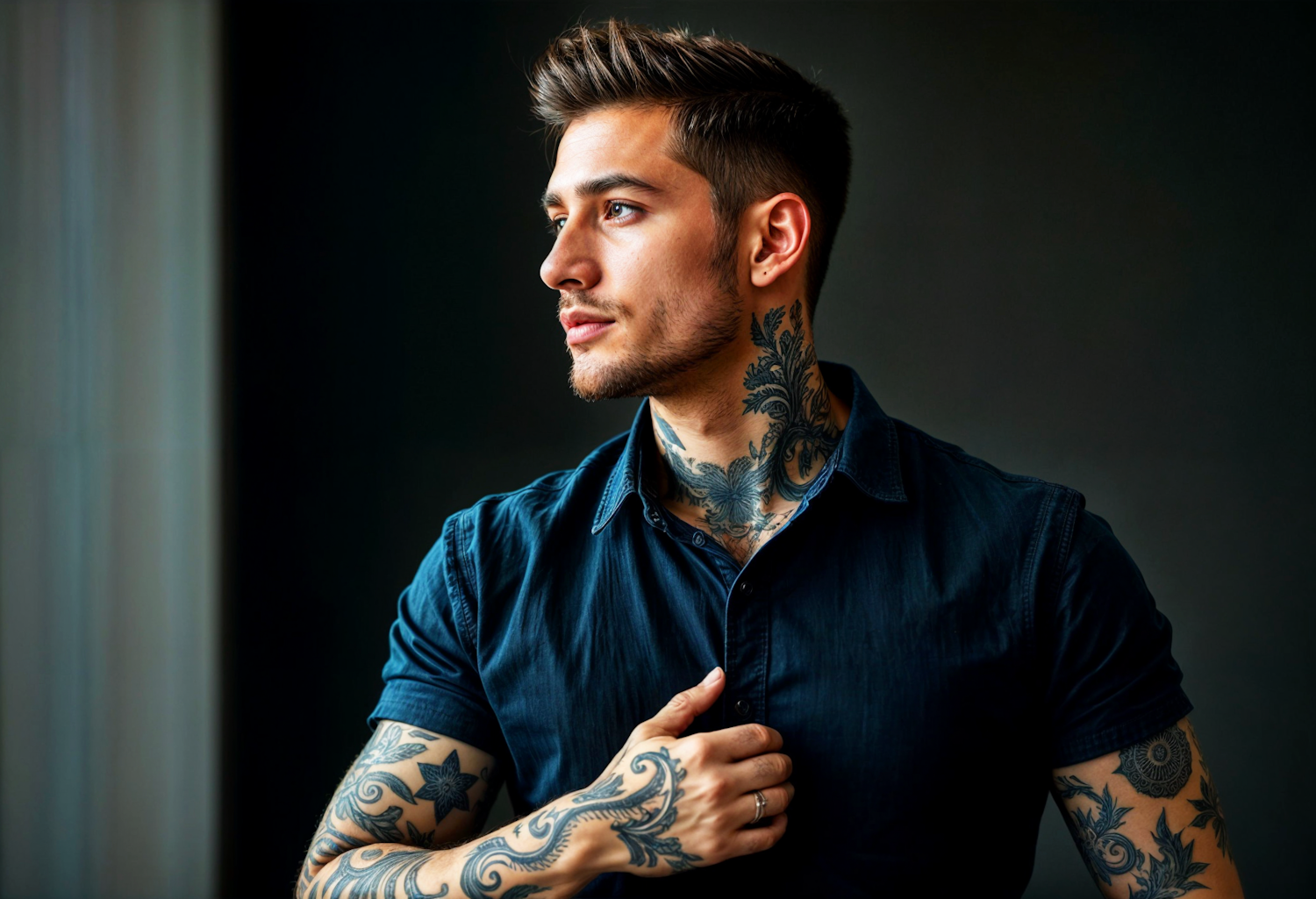 Young man with tattoos and a contemplative gaze, wearing a dark blue shirt. Intricate floral tattoos on neck and arms.