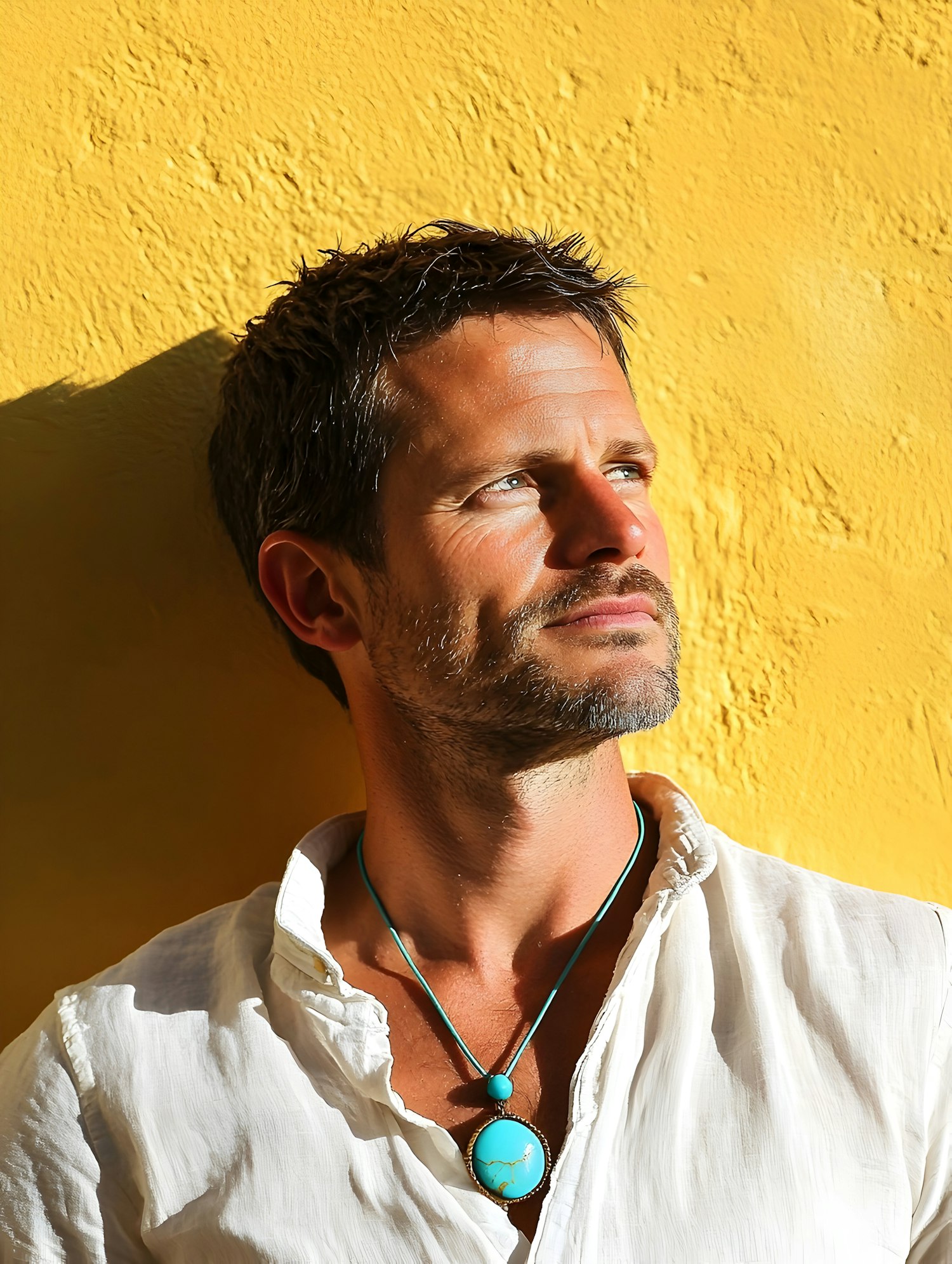 Caucasian man with blue eyes and a turquoise pendant stands against a vibrant yellow wall, wearing a white shirt and a thoughtful expression.