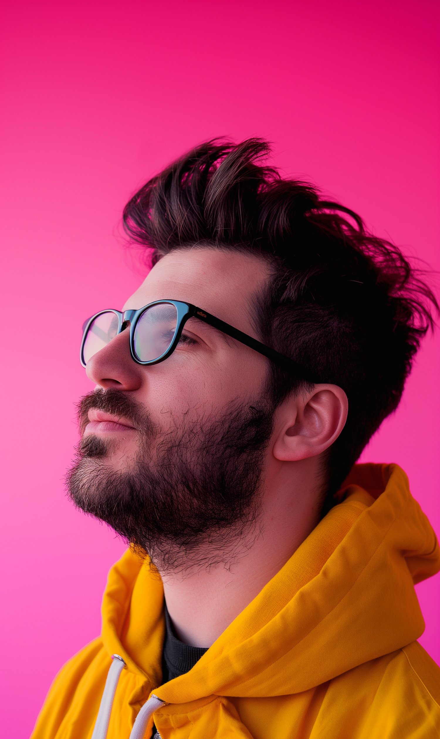 Stylish man with dark hair, beard, and glasses in a yellow hoodie against a vibrant pink background, exuding confidence.