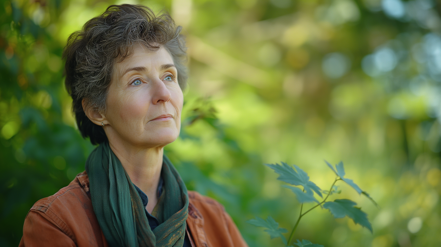 Middle-aged woman with short brown hair and blue eyes, wearing a green scarf, gazes thoughtfully in a lush, sunlit outdoor setting.