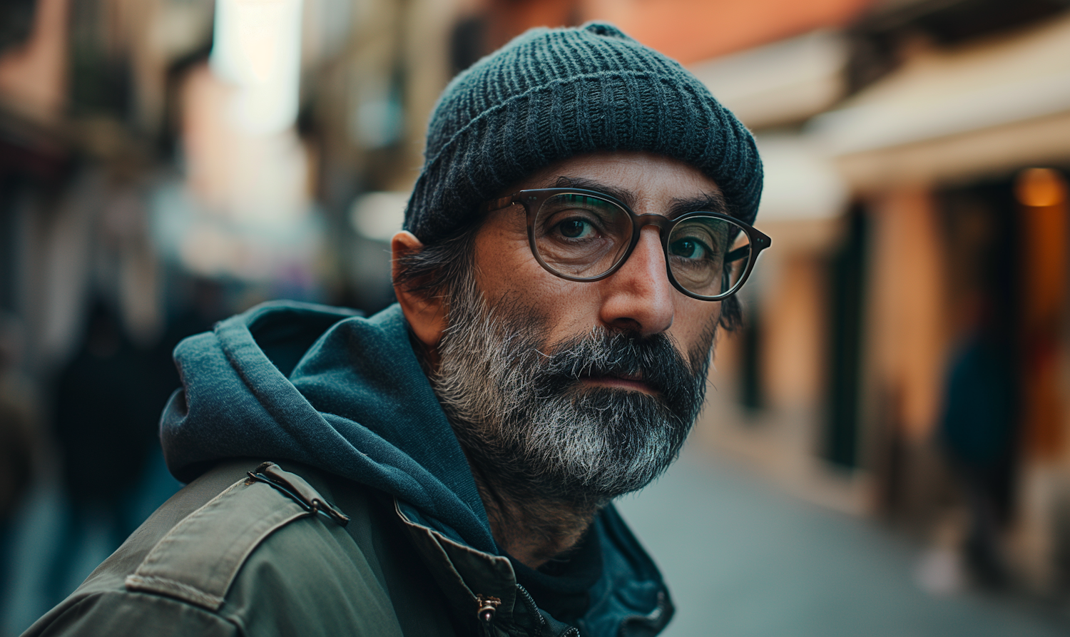 Middle-aged man with beard and glasses in urban setting, wearing a beanie and jacket. Contemplative expression, blurred street background.