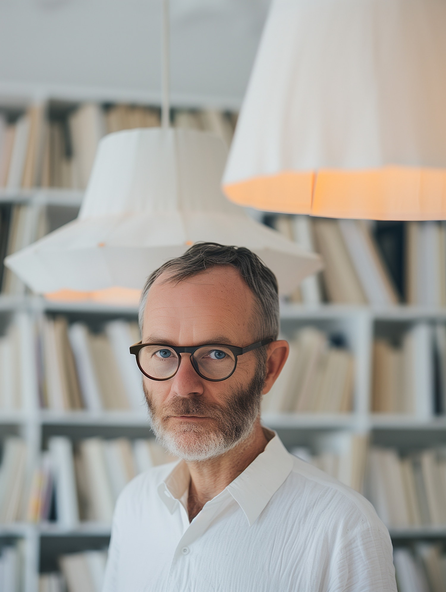 Middle-aged man with glasses and beard in a white shirt, standing in a minimalist room with bookshelves and pendant lamps.