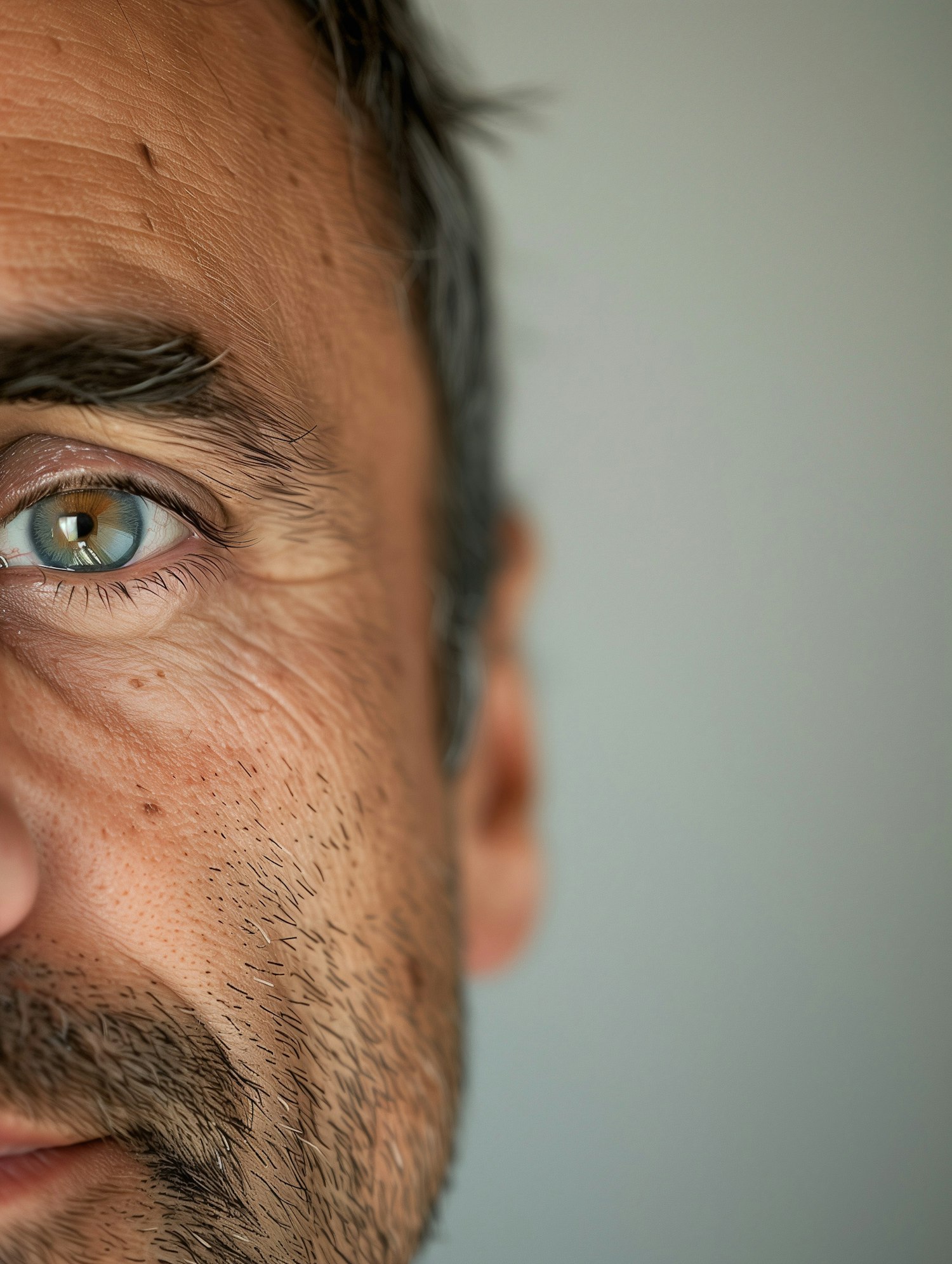 Close-up of a Caucasian man's face with blue-green eyes, stubbly beard, and graying hair against a neutral gray background.