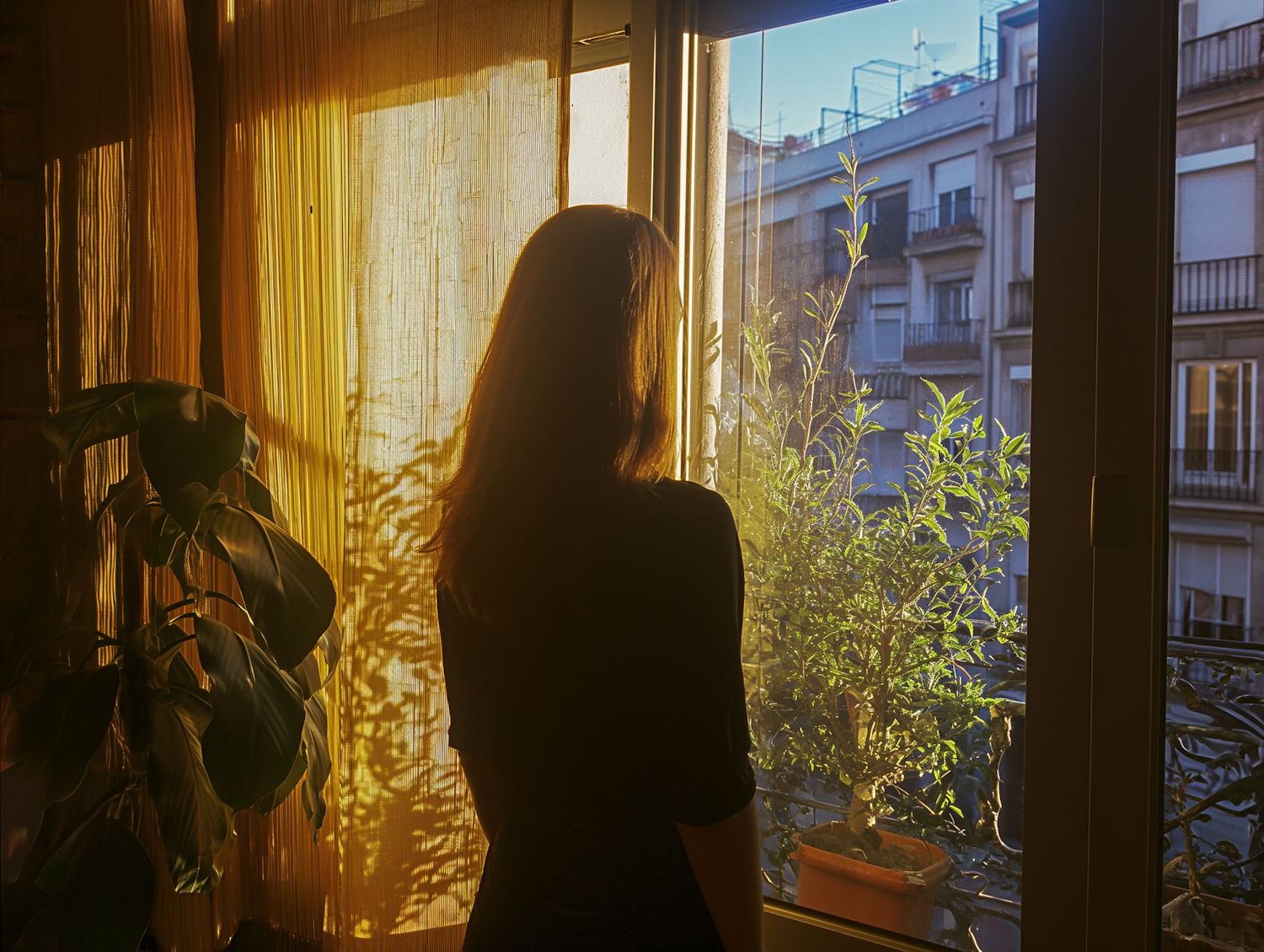 Silhouette of a person gazing out a sunlit window, with plants and urban buildings in the background.