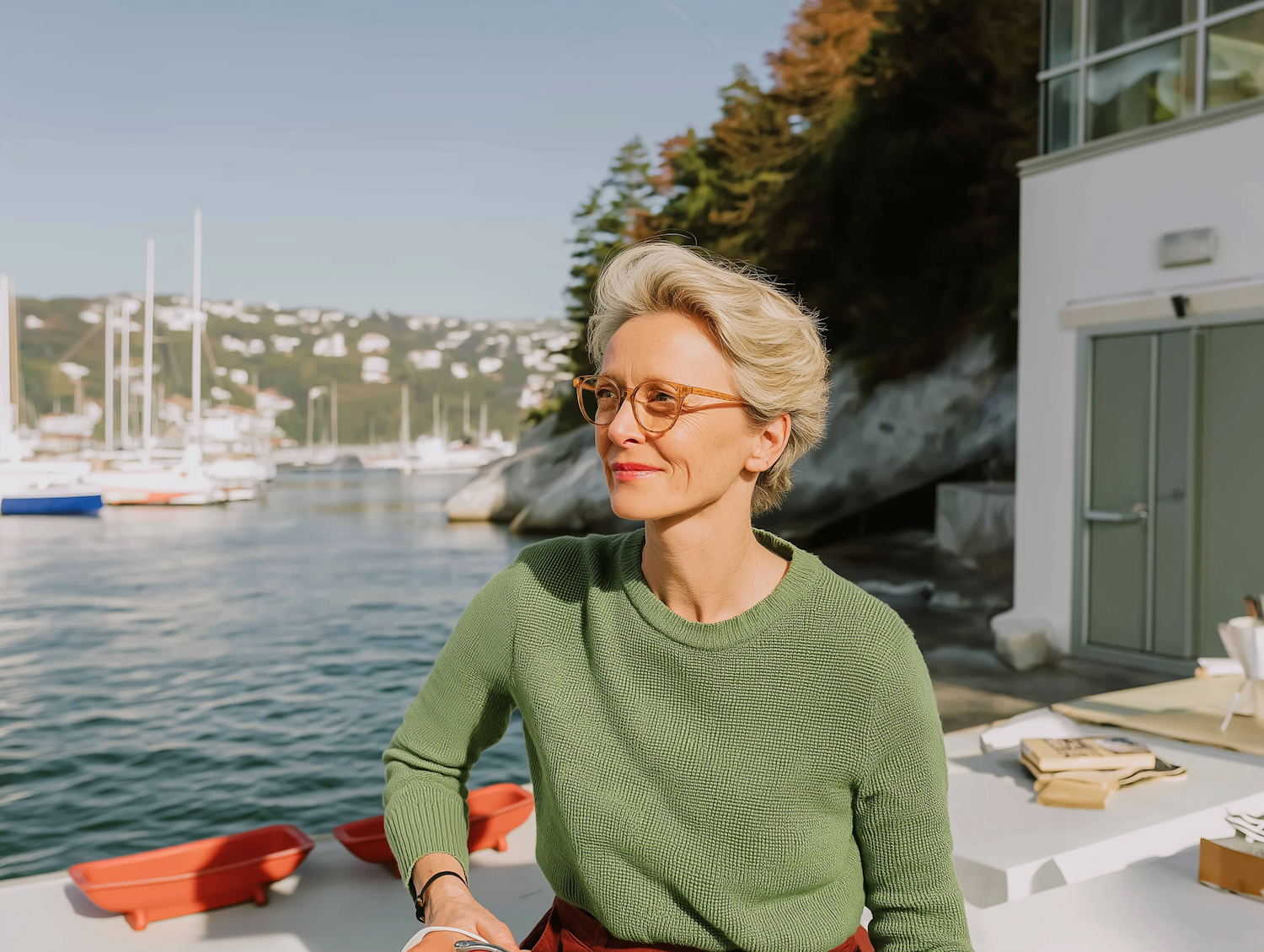 A serene portrait of a woman in a green sweater by a marina, with sailboats and a sunny waterfront in the background.