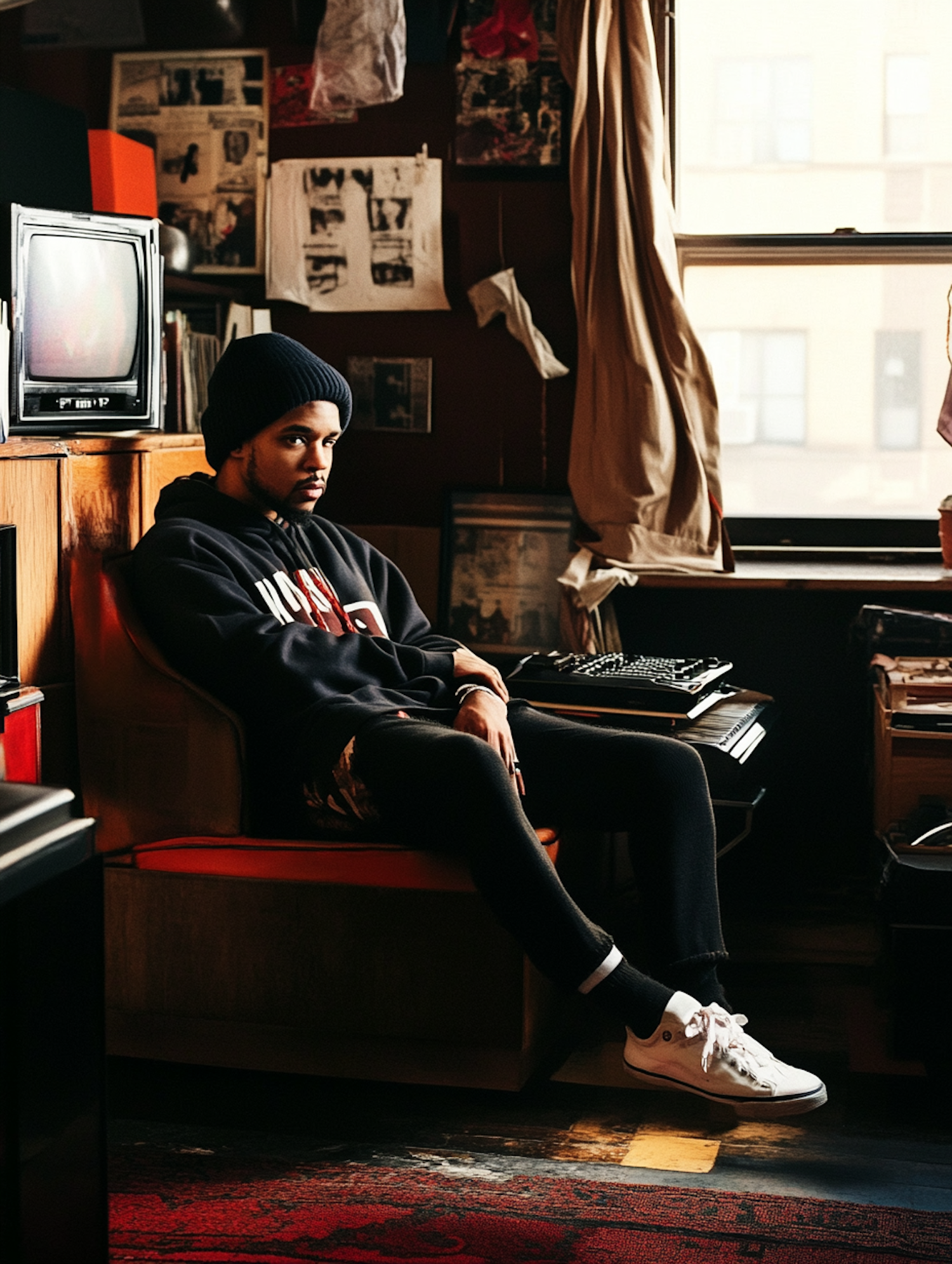 Young man in a cozy, vintage room with a relaxed vibe, wearing a beanie and hoodie, surrounded by books and an old TV.
