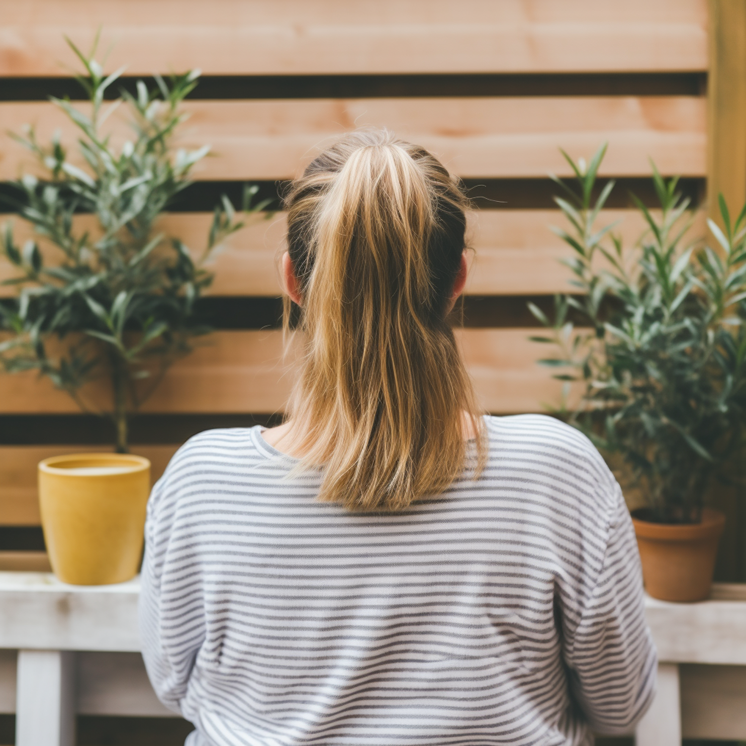 Woman with blonde ponytail in striped shirt sitting outdoors, flanked by potted plants against a wooden fence backdrop.