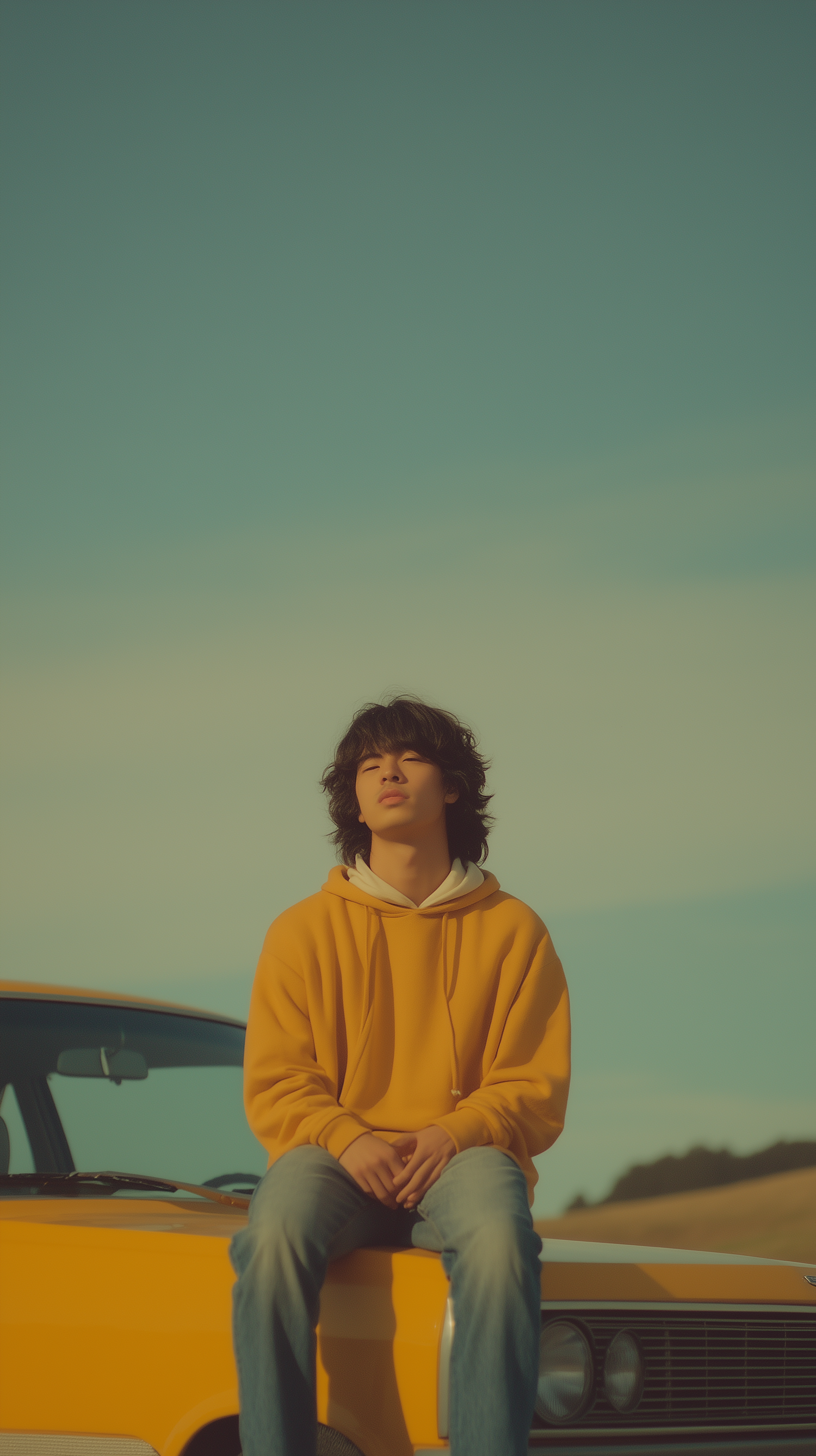 Young man in yellow hoodie sits on vintage car hood, eyes closed, under a clear sky. Warm, nostalgic vibe with soft lighting.
