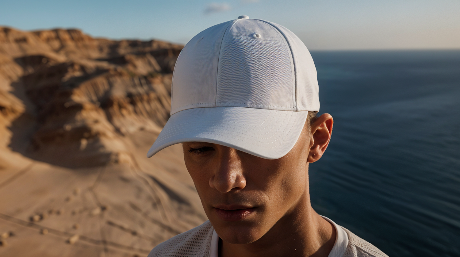Young man in a white cap gazes downward against a backdrop of cliffs and ocean, capturing a serene moment in nature.