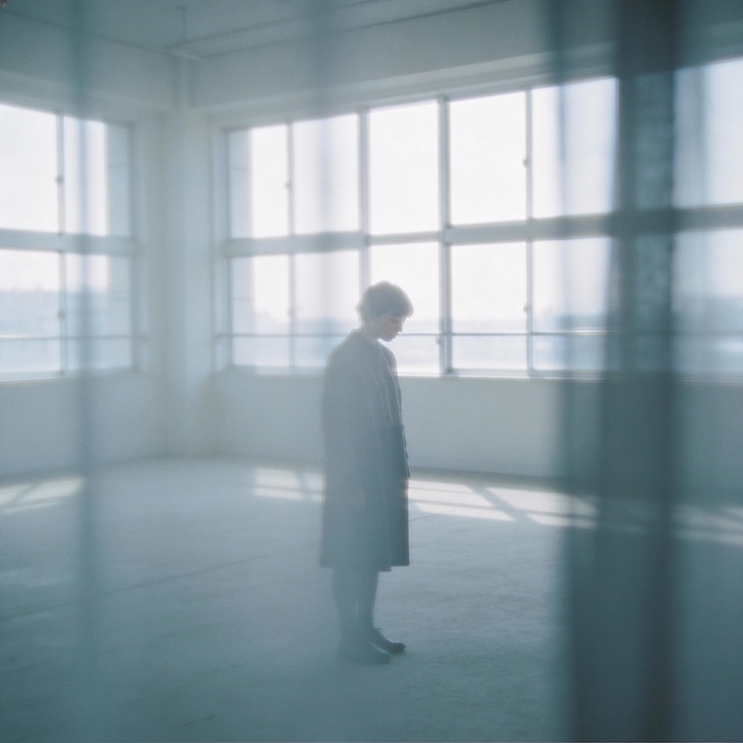 Soft editorial photography, calm and cold color palette, diffused natural light, low contrast, desaturated tones, subtle grain, shallow depth of field, soft textures, airy composition, quiet atmosphere, minimalist styling, poetic and contemplative mood, realistic photographic rendering, subject positioned deeper in the scene, softened focus, gradual loss of clarity, sense of emotional and physical separation