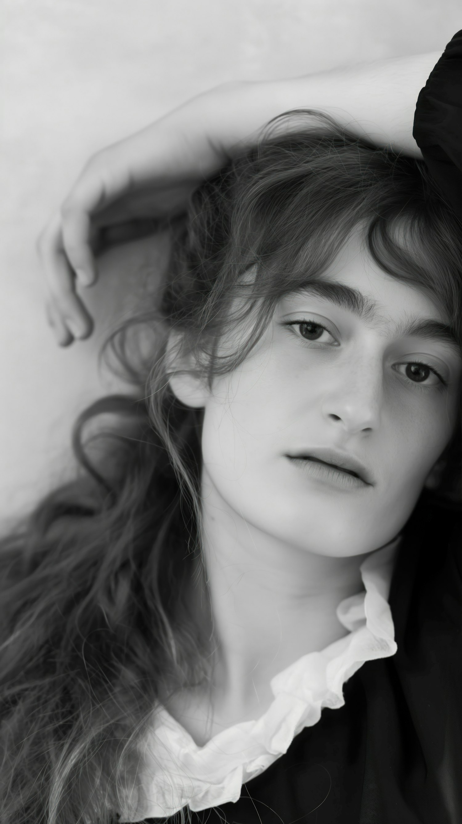 Black and white portrait of a young woman with wavy hair and a contemplative expression, wearing a dark top with a white ruffled collar.