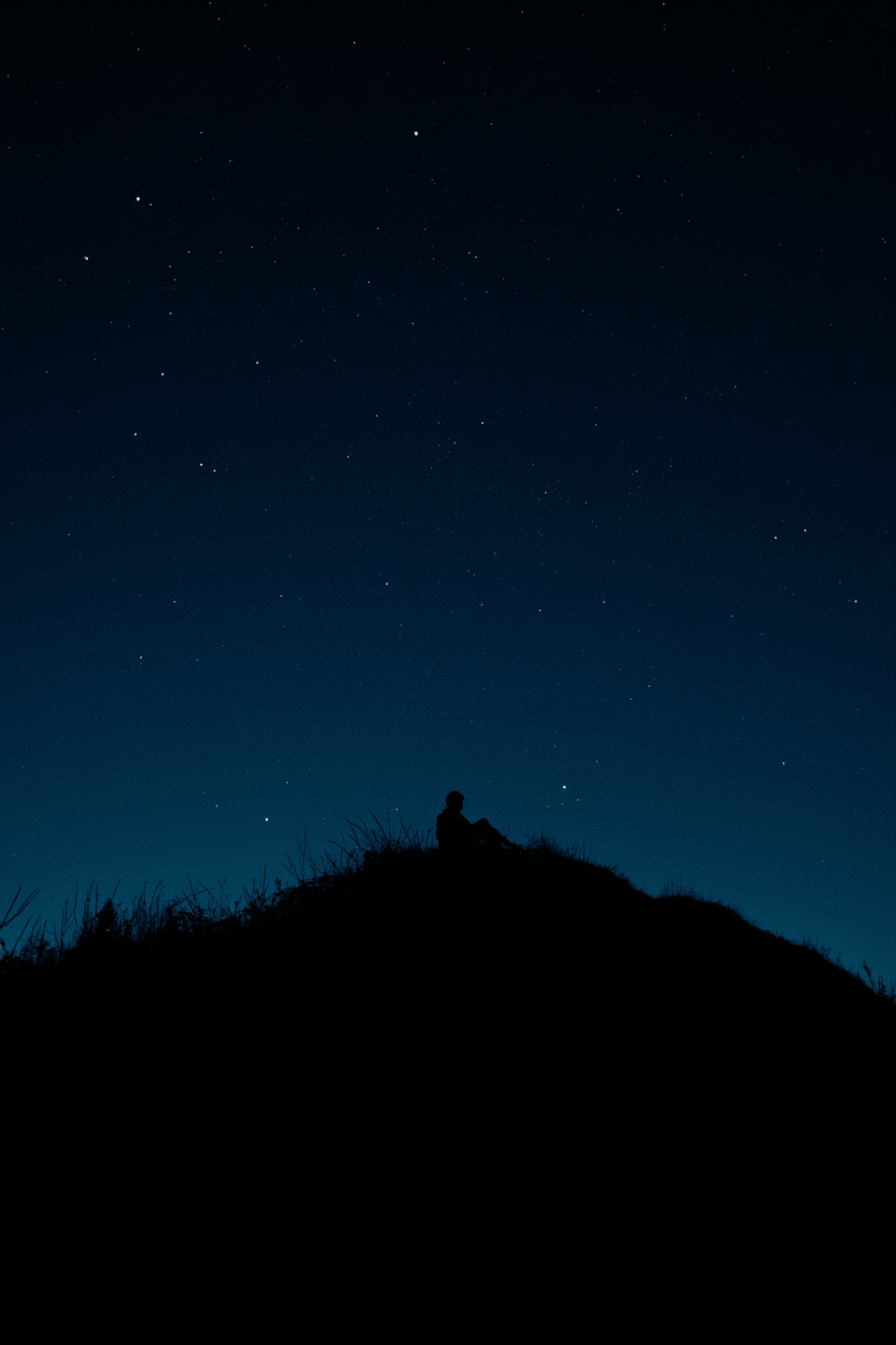 A silhouette of a person sitting on a hill under a starry night sky, evoking a sense of peace and connection with nature.