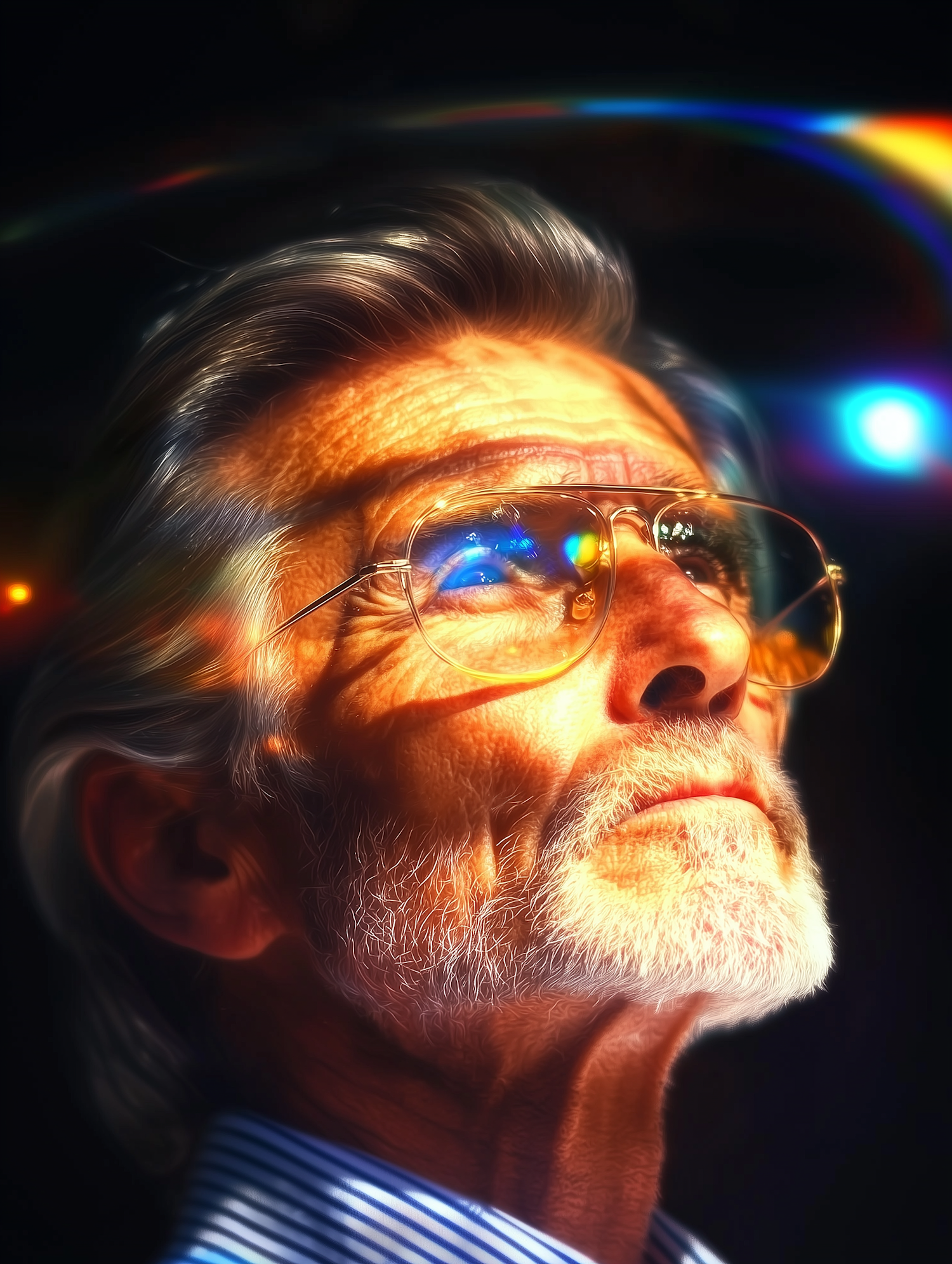 Elderly man with silver hair and beard, wearing aviator glasses, gazes upward in warm light with rainbow effects. Thoughtful expression.