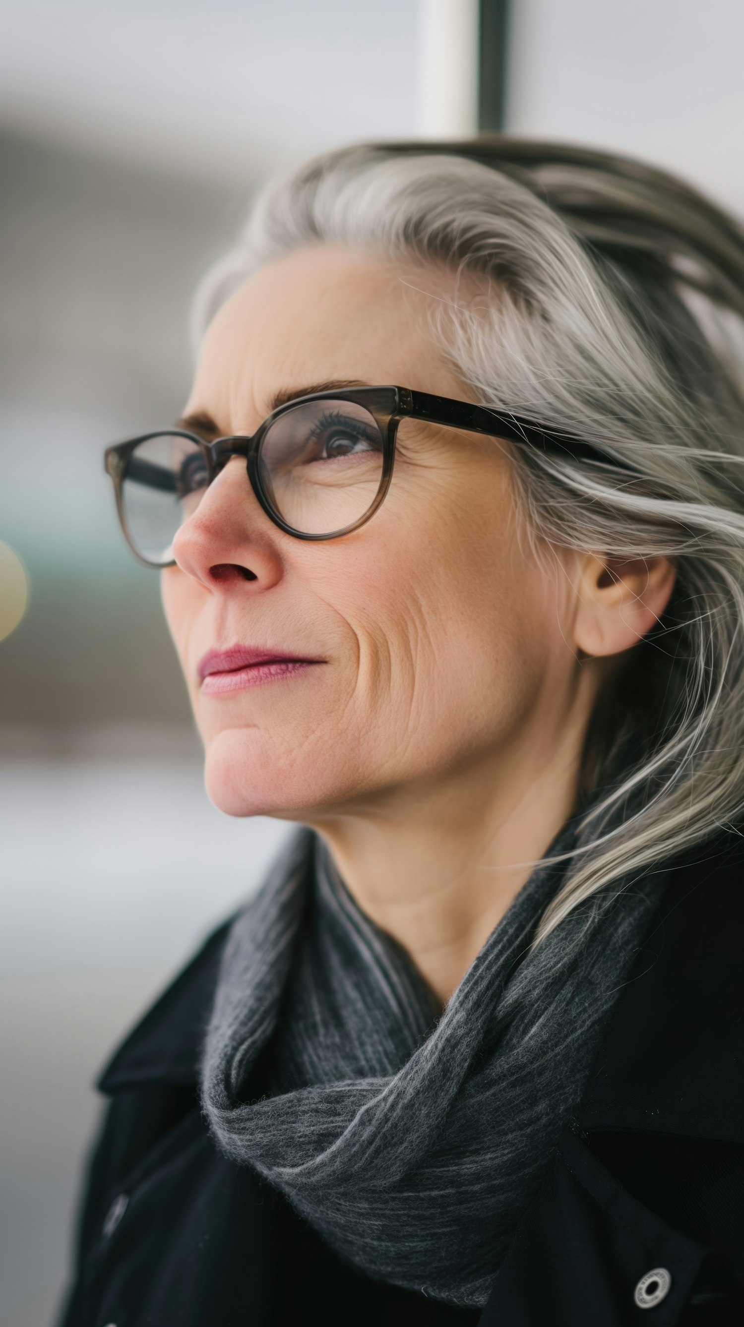 Mature woman with gray hair and glasses gazes thoughtfully, wearing a gray scarf and black coat. Serene and contemplative expression.