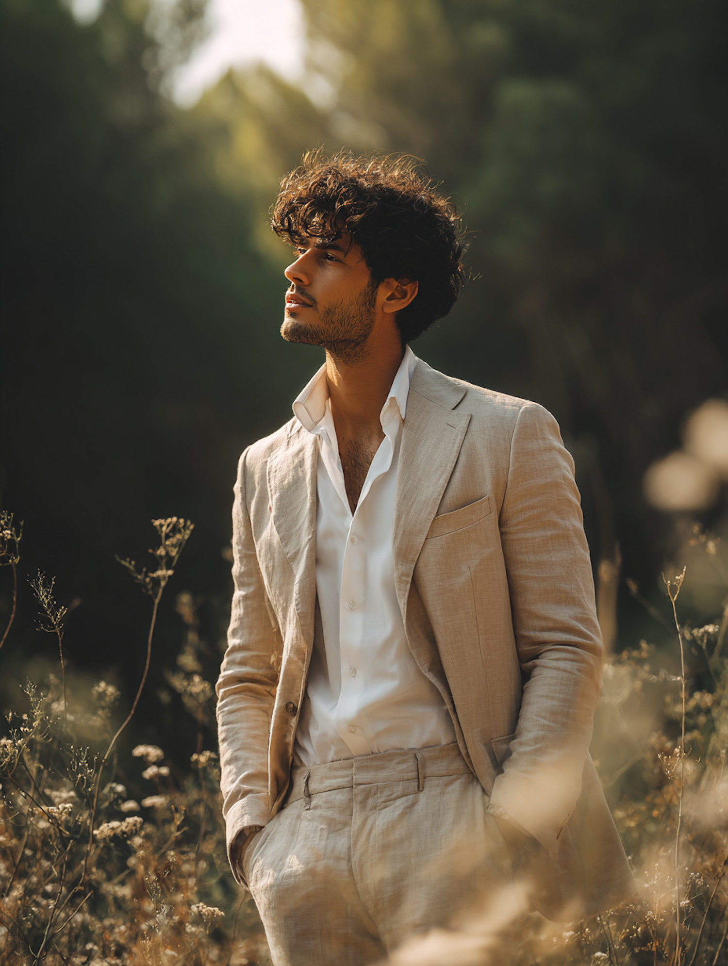 A man in a beige suit stands in a sunlit field, surrounded by wildflowers and trees, gazing thoughtfully into the distance.