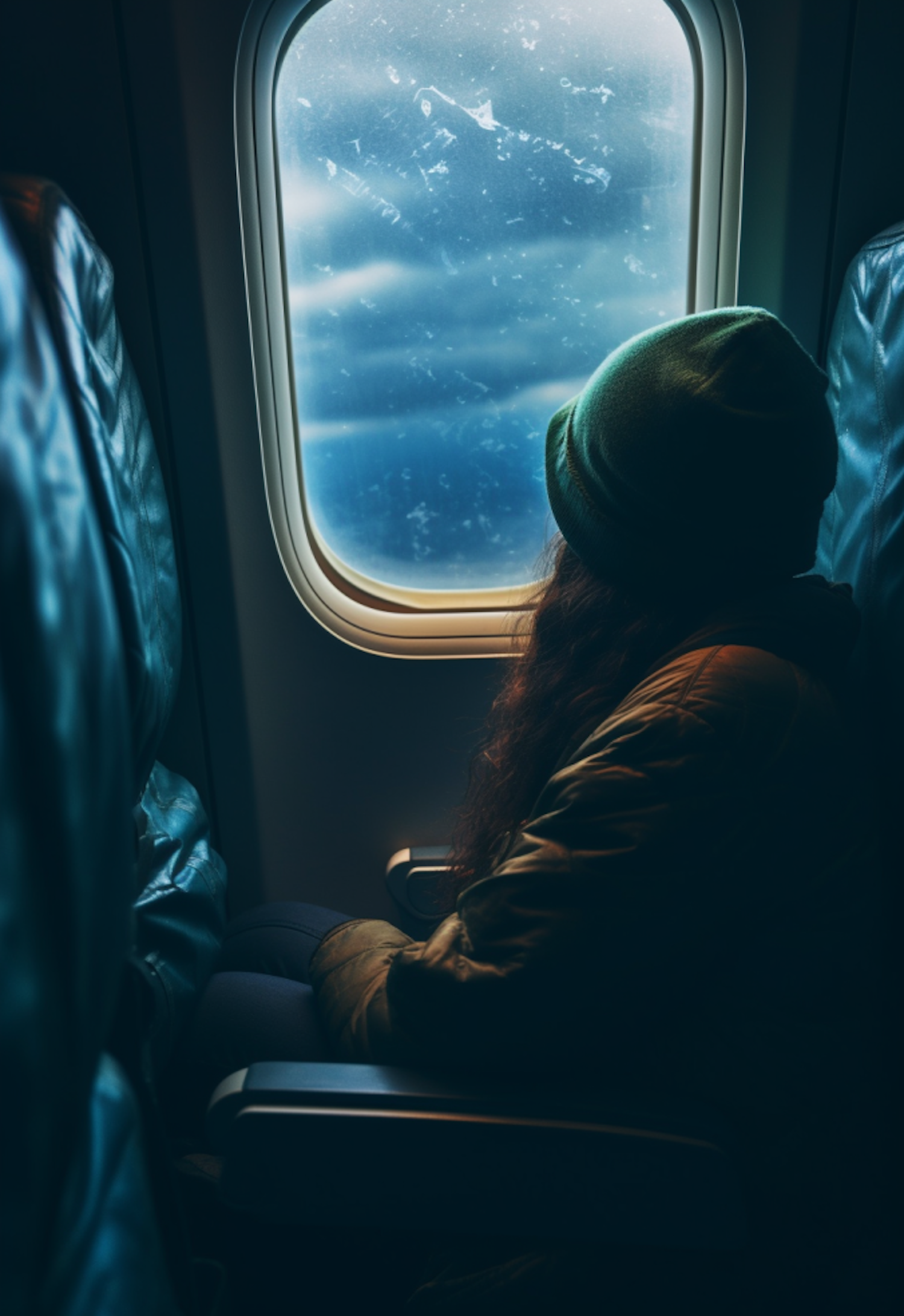 Person in a green beanie gazing out an airplane window at a cloudy sky, creating a serene travel moment.