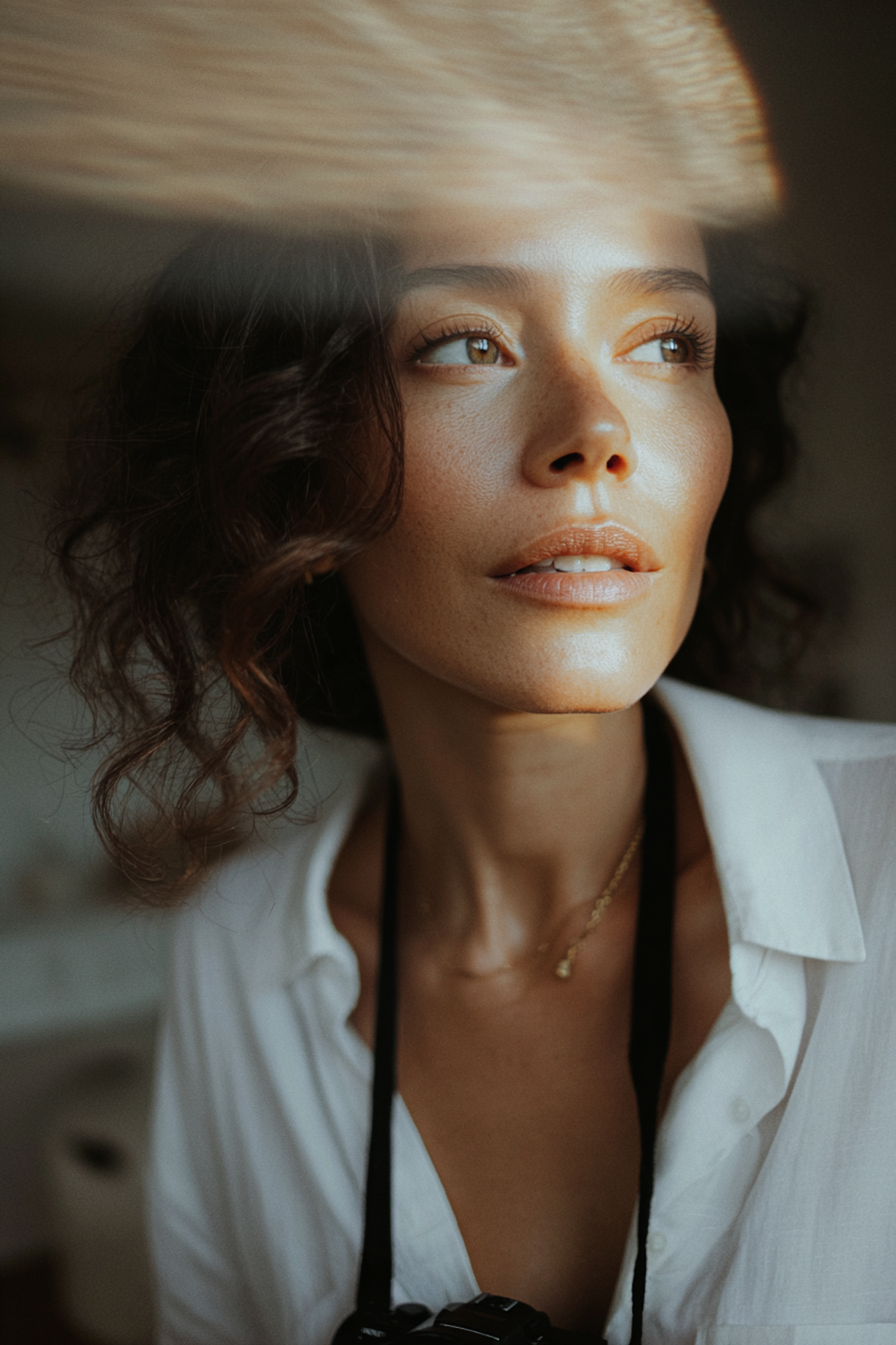 A woman with curly hair and a camera strap gazes thoughtfully, illuminated by warm light, creating a serene and artistic mood.