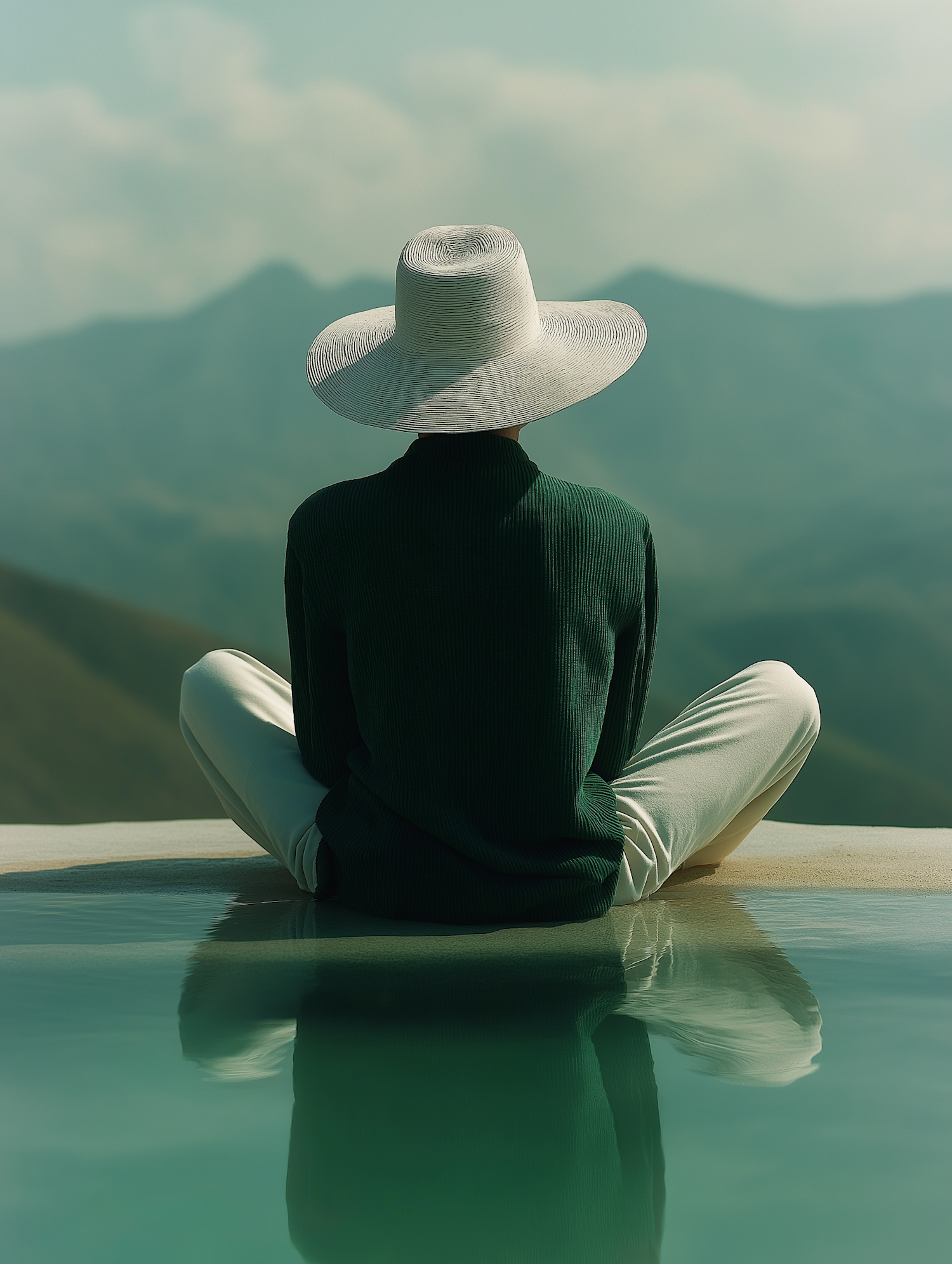 Person in a wide-brimmed hat sits by a tranquil pool, reflecting serene hills in the background. Calm and peaceful setting.