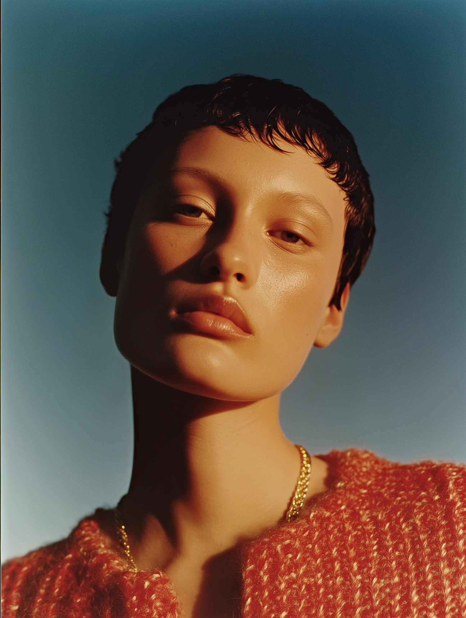 Close-up portrait of a person with short hair, wearing a red textured garment and gold chain, set against a gradient blue background.