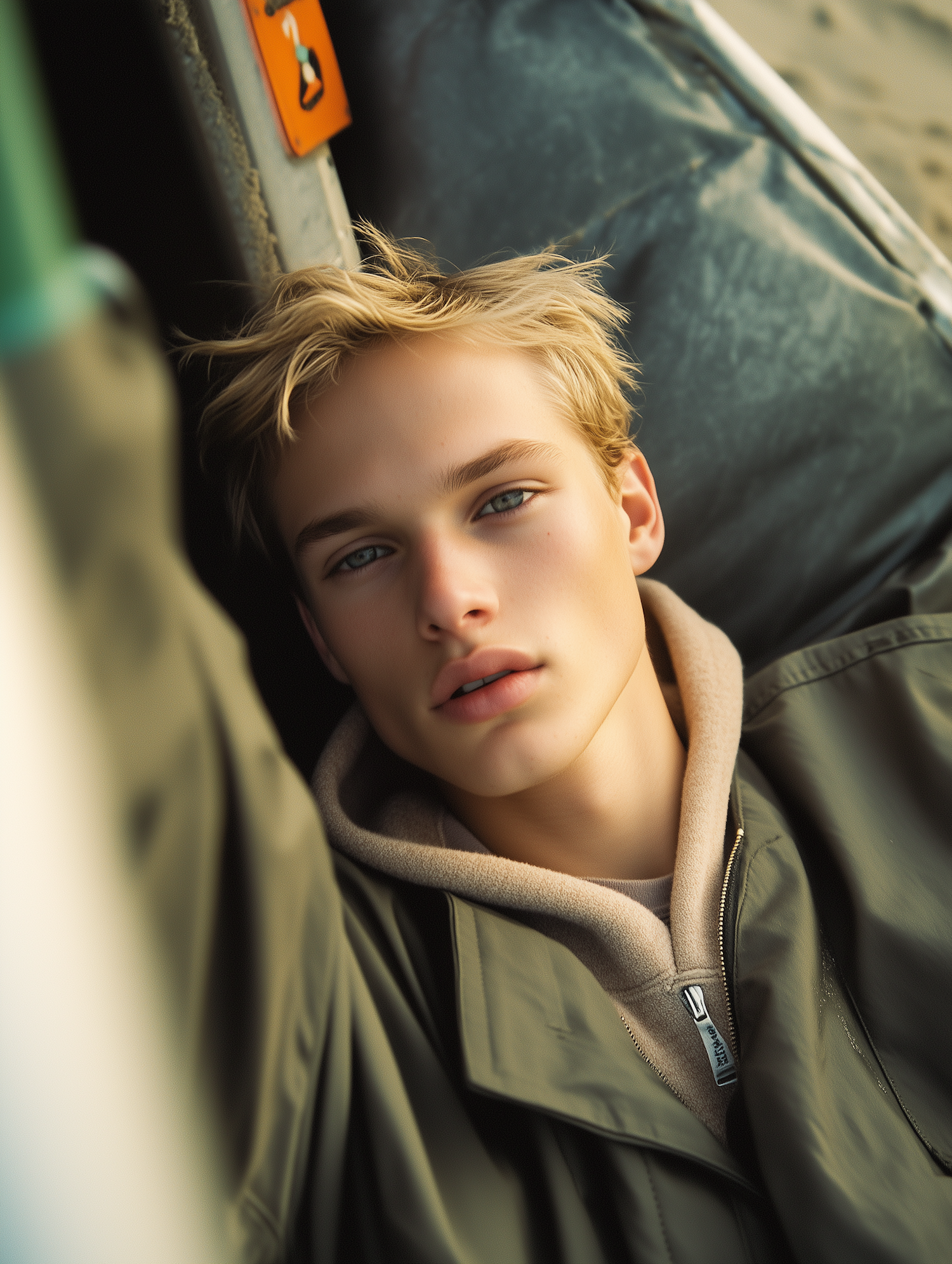 Young man with blonde hair and blue eyes in a khaki jacket, lying down with a serene expression. Soft lighting and blurred background.