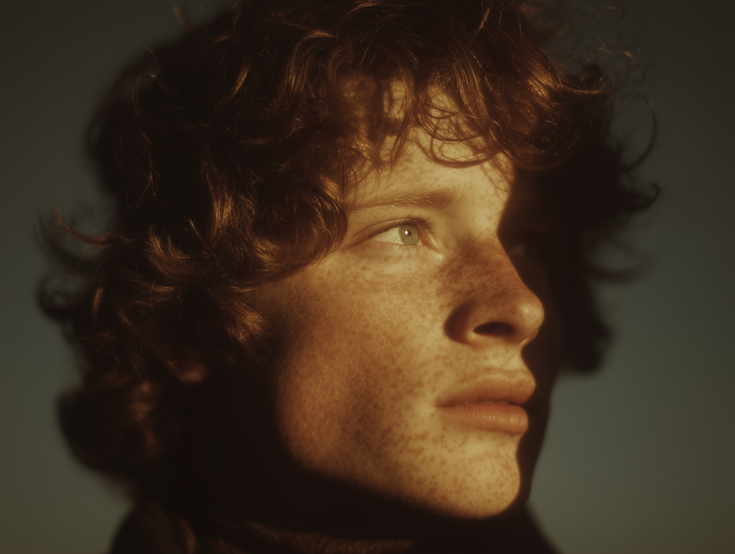 Close-up portrait of a freckled individual with auburn hair, warm lighting, and a contemplative expression, creating a dramatic and natural effect.