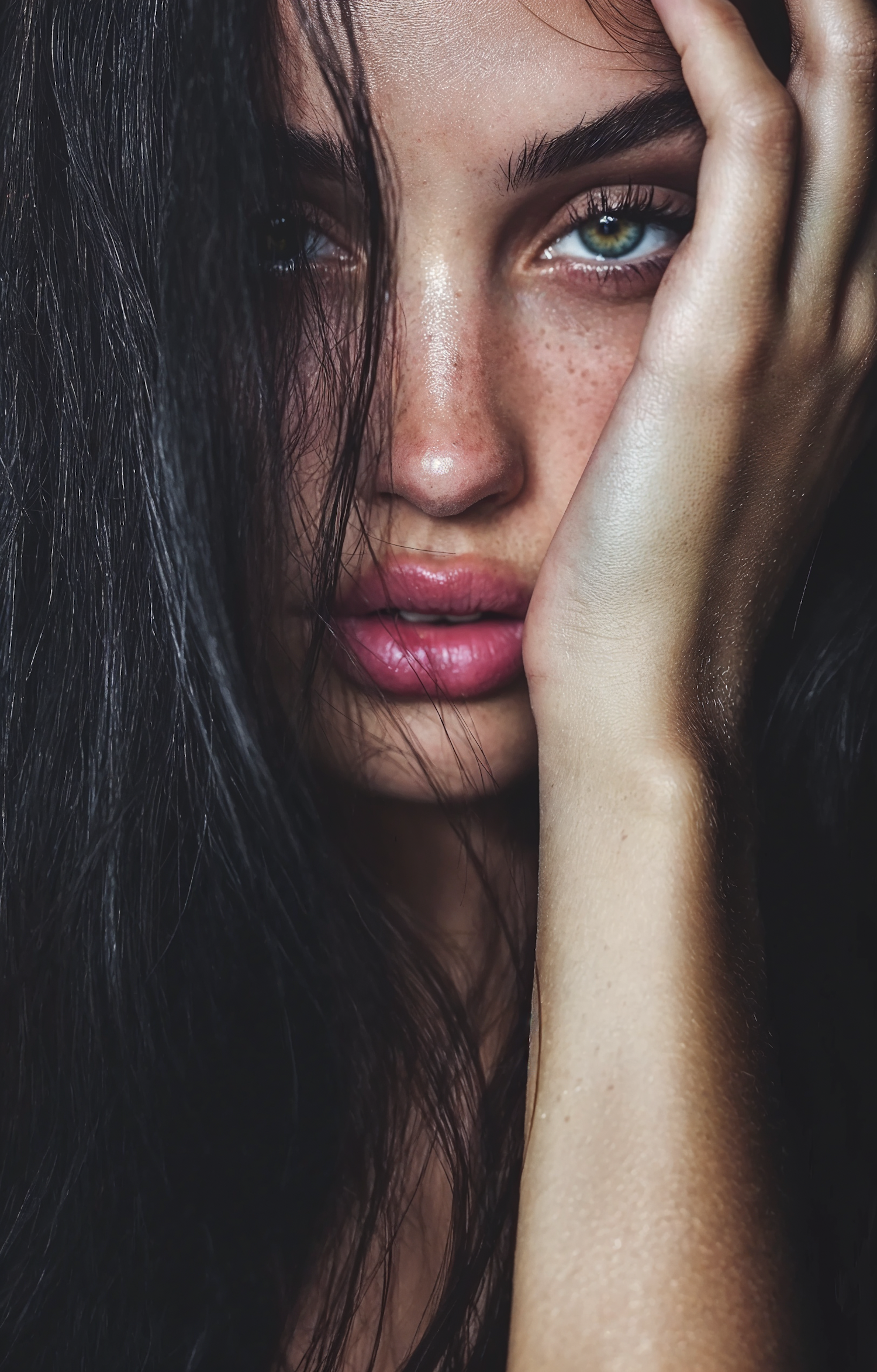 Close-up of a woman with green eyes, freckles, and dark hair, resting her hand on her face in a contemplative pose.