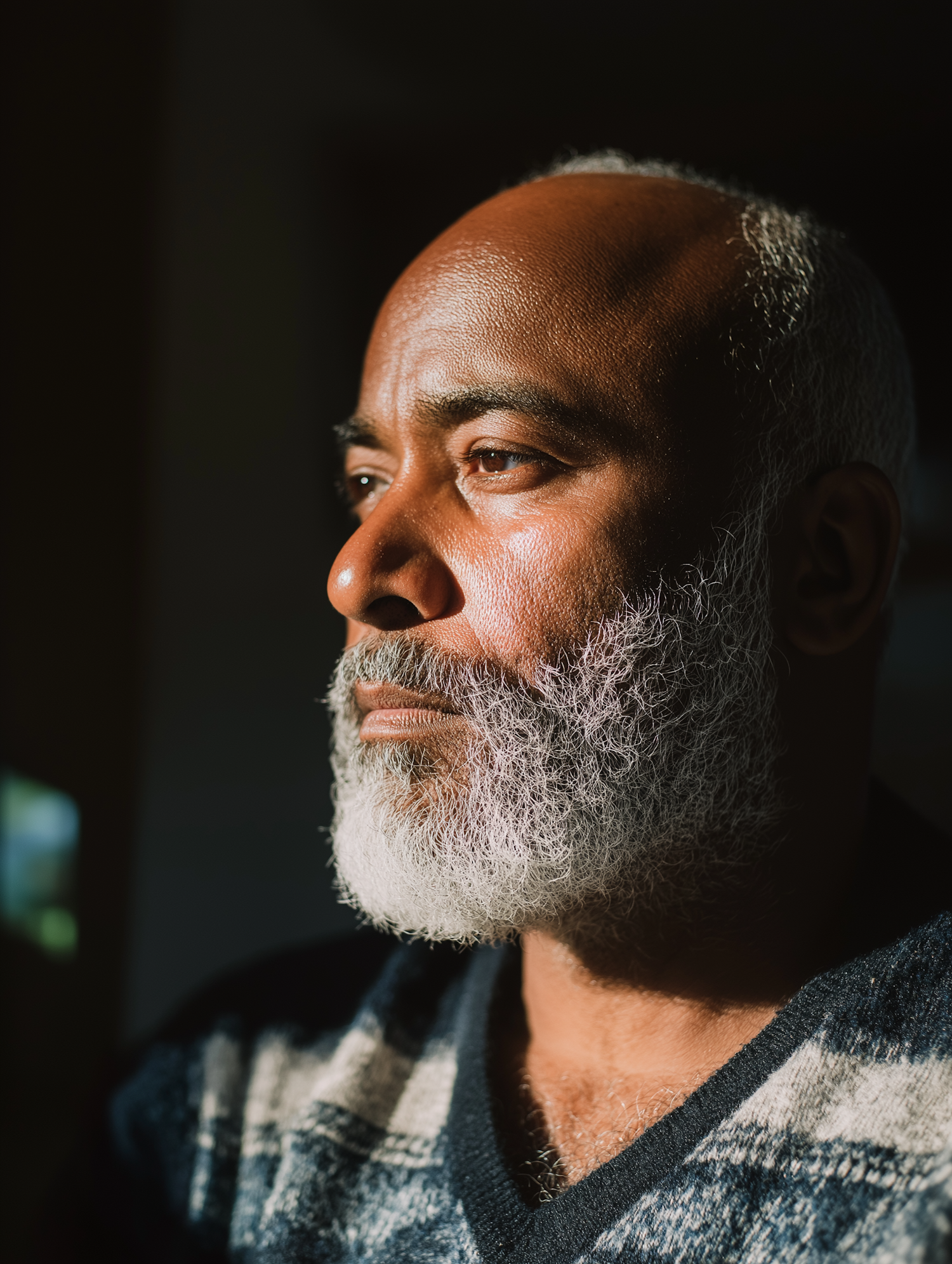 A handsome older man with a white beard and warm lighting highlights, expressing serenity, wearing a sweater in a softly lit environment.
