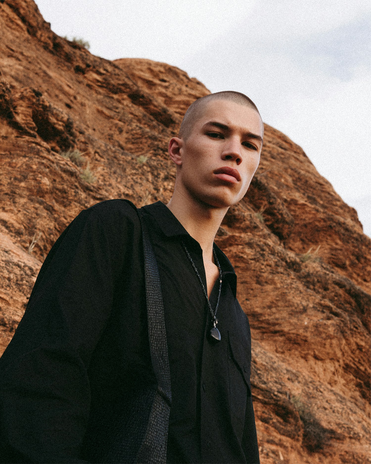 A person in a black shirt stands against rugged red rocks, creating a striking contrast between the subject and the natural background.