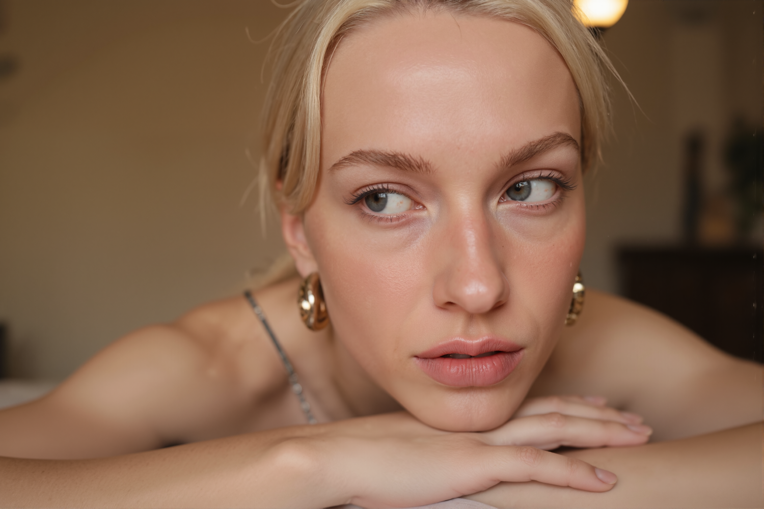 Close-up of a blonde woman with green eyes, minimal makeup, and gold hoop earrings, resting her chin on her hands in a contemplative pose.