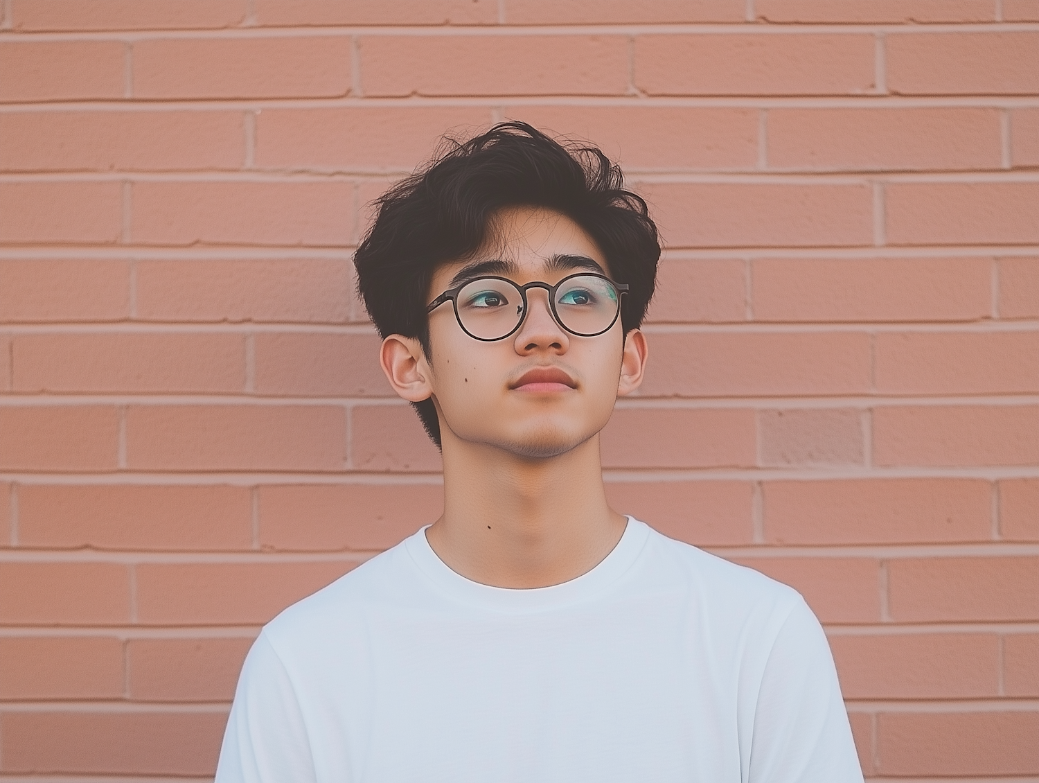 Asian male with glasses and white t-shirt against a pink brick wall, looking thoughtful. Soft lighting highlights his calm demeanor.