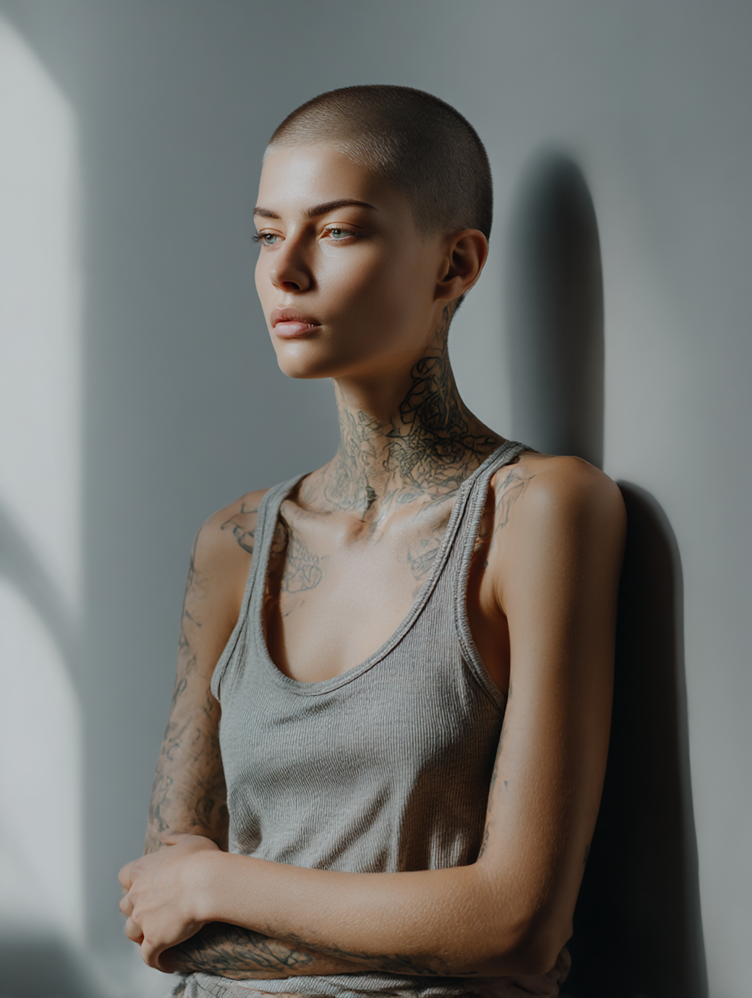 A contemplative individual with a shaved head and tattoos, wearing a gray tank top, in soft lighting against a minimal background.