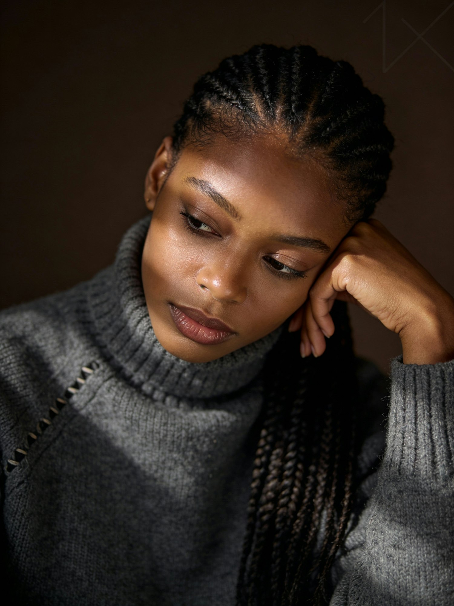 A Black woman with deep brown skin and long, neatly braided hair rests her face gently on her hand in a contemplative pose. Her expression is serene and introspective, evoking quiet strength and emotional depth. She wears a soft, charcoal knit turtleneck sweater—minimalist and textured—whose tone subtly echoes the background while adding warmth and tactile depth to the composition. The lighting is dramatic and directional, casting soft highlights across her skin and accentuating its smooth texture and natural sheen. She is framed against a plain, dark background—charcoal or deep espresso brown—to create visual contrast and draw focus to her features. The composition is intimate and minimalist, emphasizing mood, gesture, and the quiet power of presence. Hyperrealistic rendering should highlight skin texture, braid detail, knit fabric, and the interplay of light and shadow with emotional clarity and visual precision.