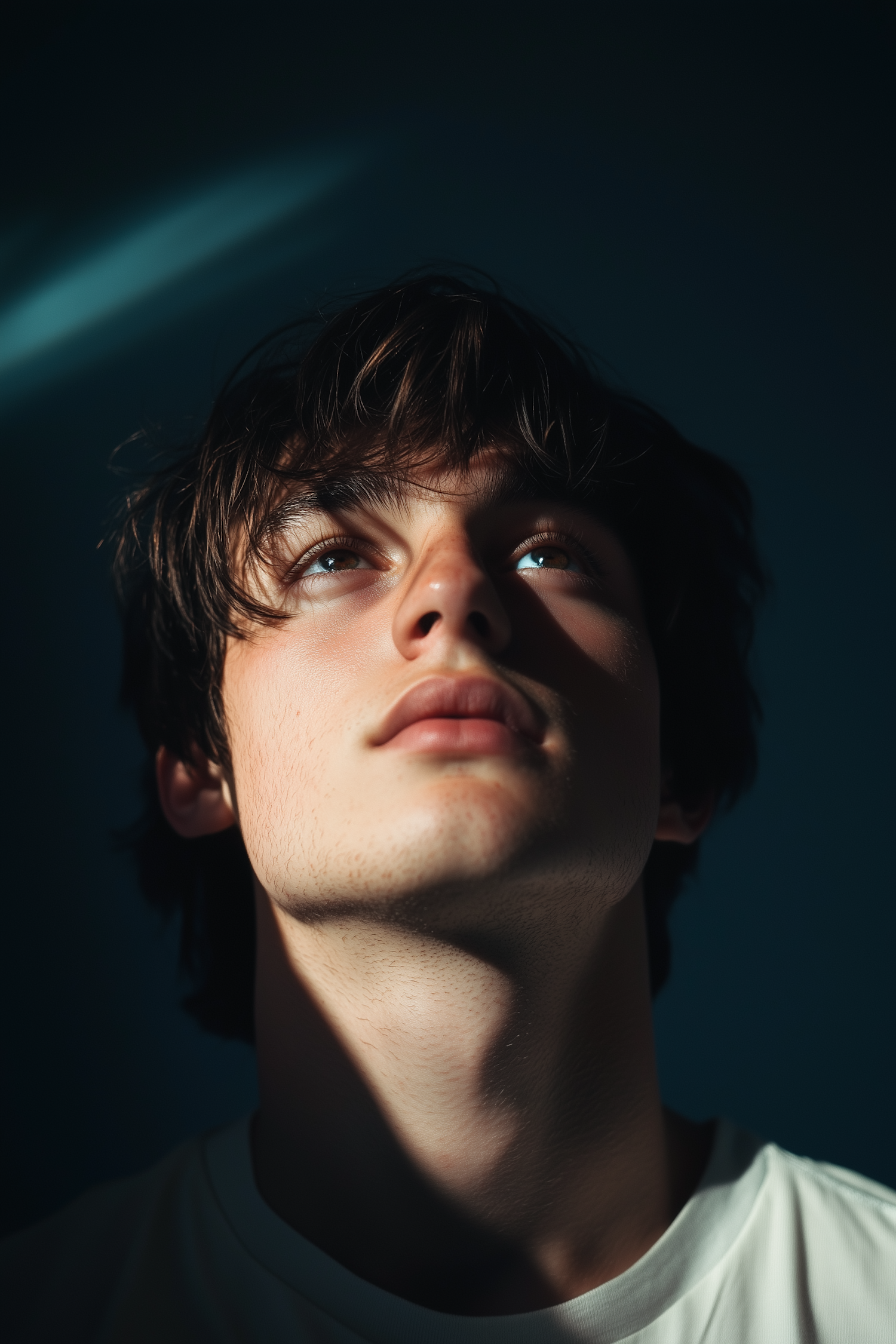 Young man with dark hair and blue eyes gazes upward, illuminated by soft light against a teal background.