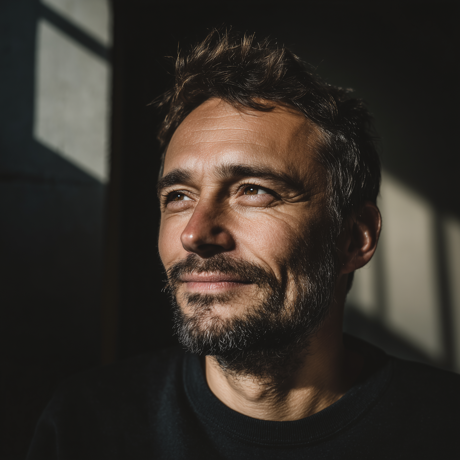 Close-up of a man with a beard in dramatic lighting, sunlight casting shadows on his face, creating a contemplative and artistic mood.