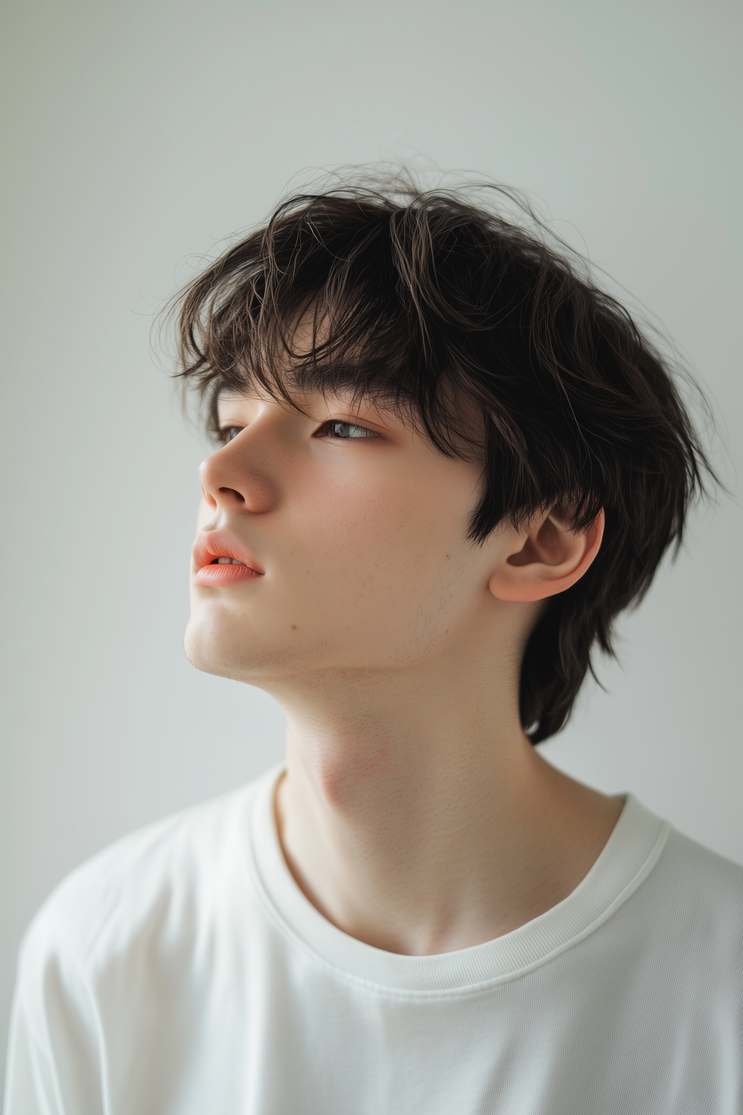 Young man with tousled dark hair and a contemplative gaze, wearing a white t-shirt against a soft, neutral background.